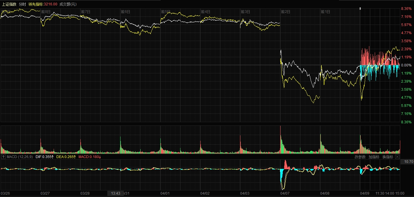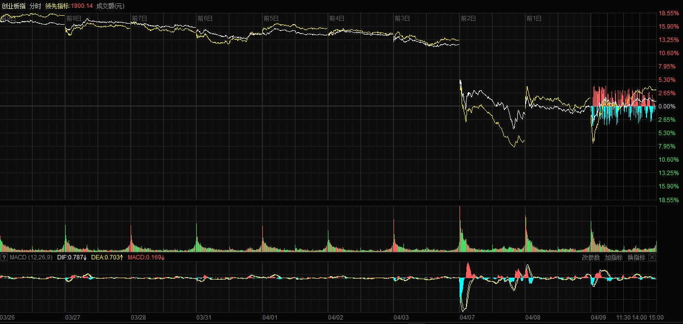 天山网-新疆日报讯 (记者康颢严报道)4月9日,A股三大指数集体上涨。截至收盘,上证指数涨1.31%,报收3186.81点;深证成指涨1.22%,报收9539.89点;创业板指涨0.98%,报收1858.36点;北证50指数涨10.27%,报收1206.75点。沪深京三市成交额超1.7万亿元,较昨日放量近千亿元。