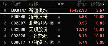 今日,新赛股份连收四个涨停板,涨幅居新疆板块之首,上涨10.08%,报收5.68元;北新路桥上涨10.03%,报收3.95元;天顺股份上涨10.01%,报收13.19元;贝肯能源上涨10.01%,报收8.13元;中油资本上涨9.95%,报收6.74元。立新能源、新农开发、百花医药、洪通燃气、天富能源跌幅居前。