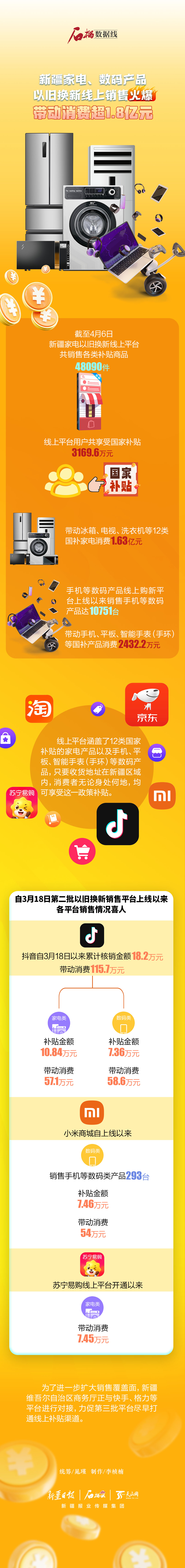 截至4月6日,新疆家电以旧换新线上平台共销售各类补贴商品48090件,线上平台用户共享受国家补贴3169.6万元,带动家电、数码产品消费超1.8亿元。