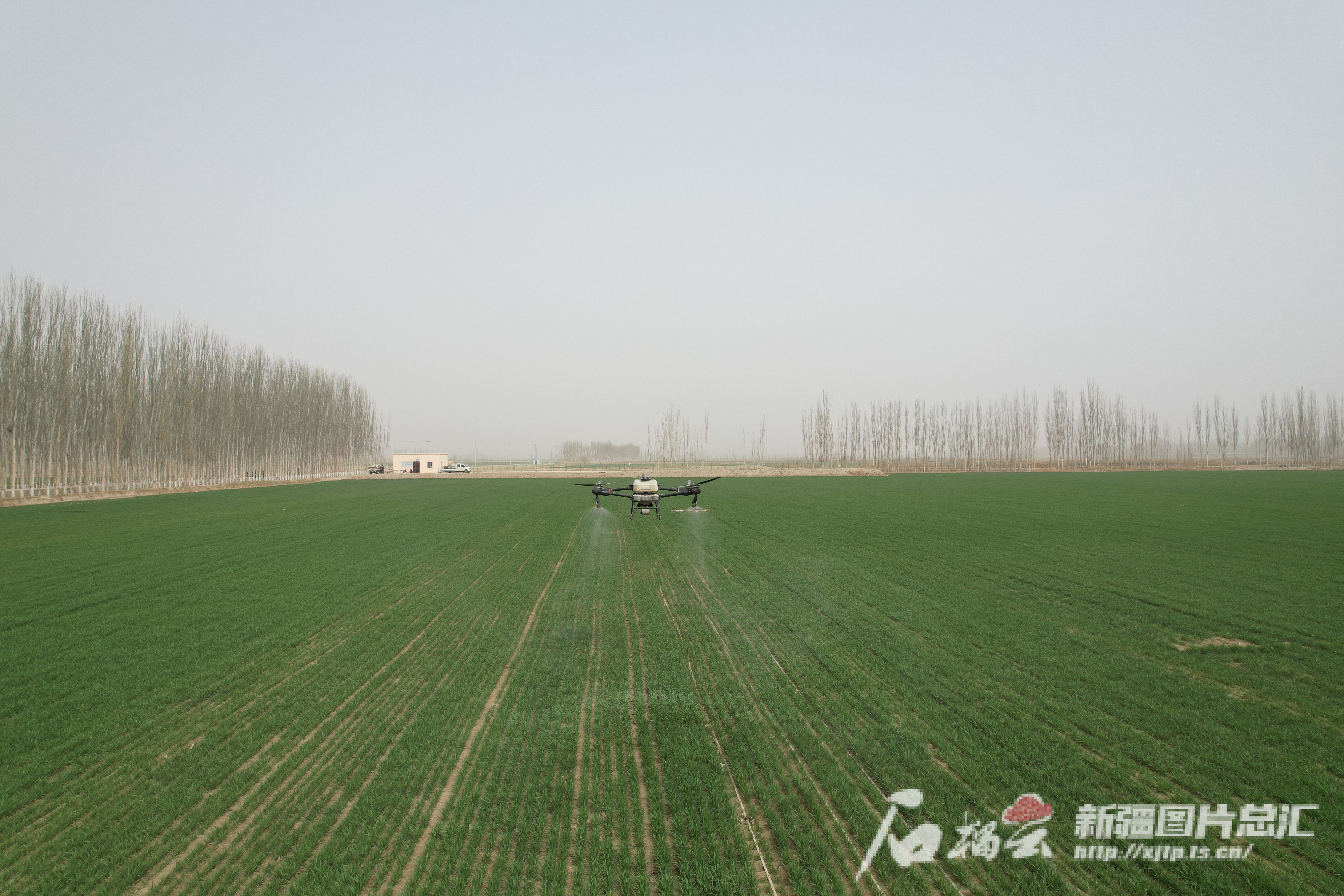 4月2日,在新和县广袤的麦田上空,植保无人机正进行田间作业。张冲 摄