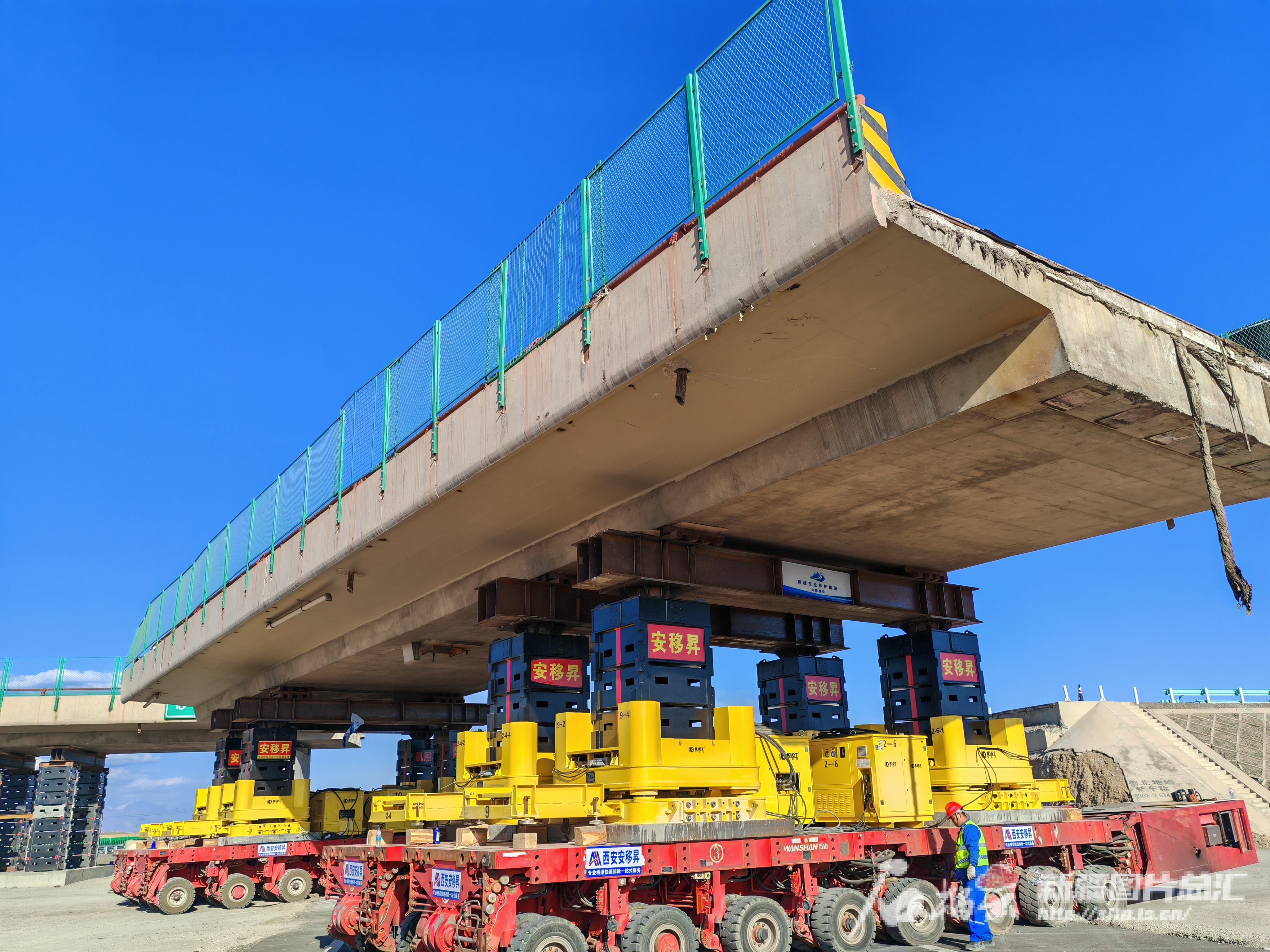 模块车顶升系统用力顶起一段梁体,以每小时2公里的速度缓慢前行。突然,车辆停了下来。
