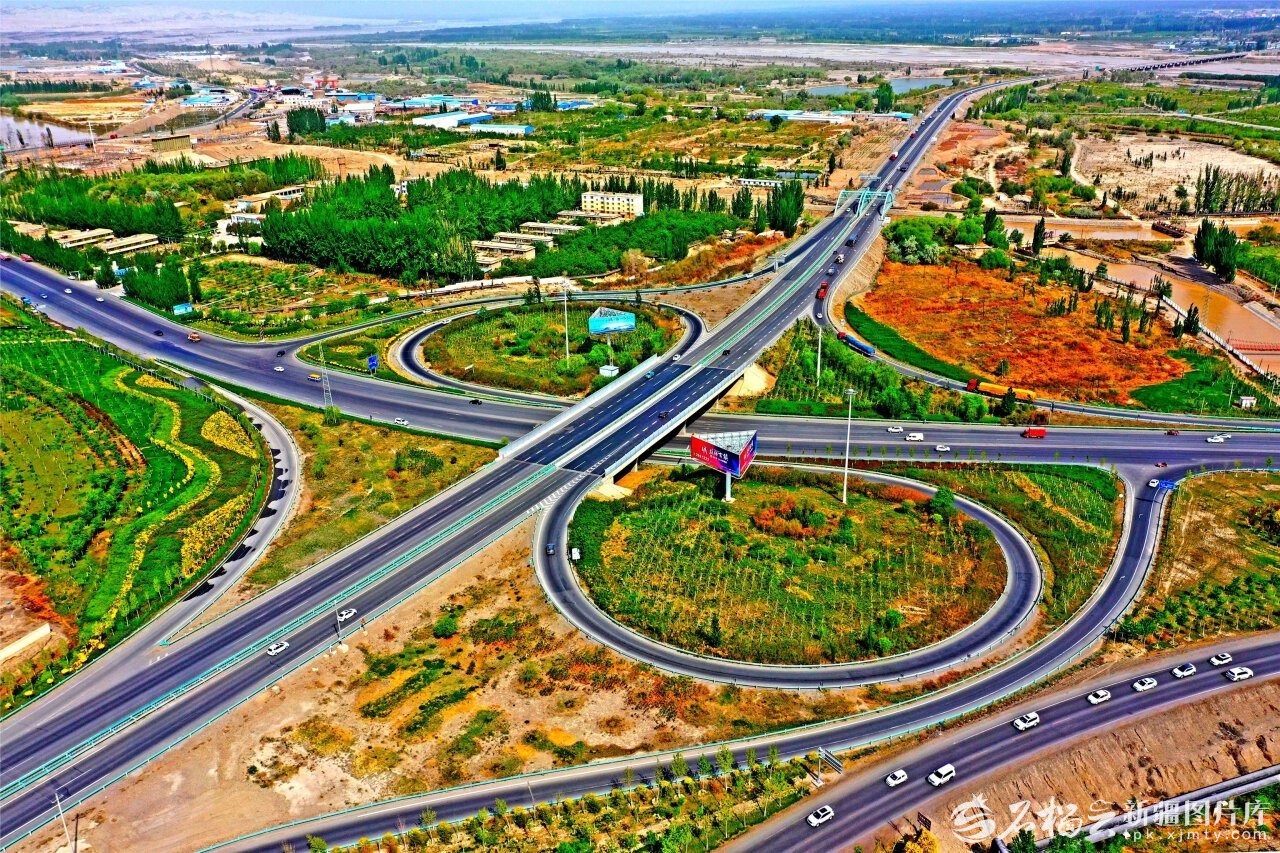 俯瞰位于阿克苏市的吐和高速G3012公路和G219公路互通立交桥(2021年5月1日无人机摄)。 天山网-新疆日报记者蔡增乐摄