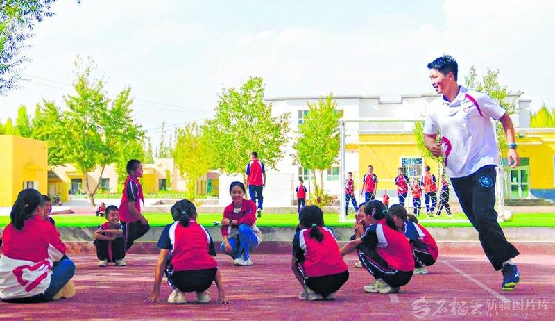 在阿图什市哈拉峻乡谢依特小学的操场上,志愿者徐福亭带领学生开展课外活动(9月1日摄)。熊宣然摄
