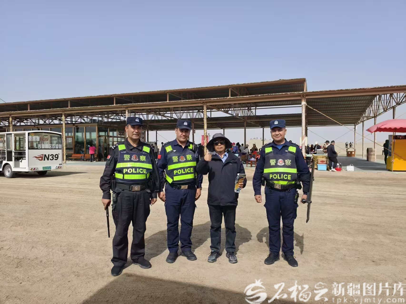 “我能和你们合个影吗?”10月5日,在麦盖提县N39°沙漠旅游景区,黑龙江游客梁先生以此表达对执勤警务人员的敬意和谢意。“看到你们在沙漠里值守,特别感动,你们辛苦了!”梁先生动情地说。