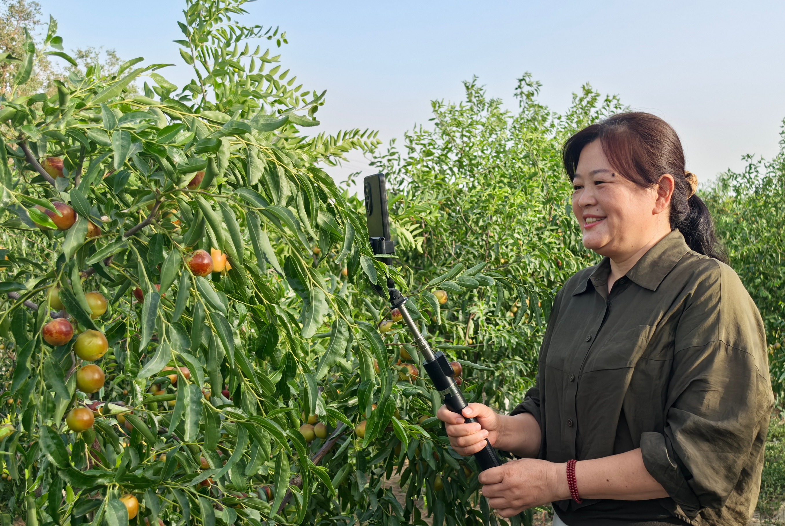 10月9日,在尉犁县兴平镇哈拉洪村枣园里,王晓红正直播介绍冬枣。唐雪芹 摄