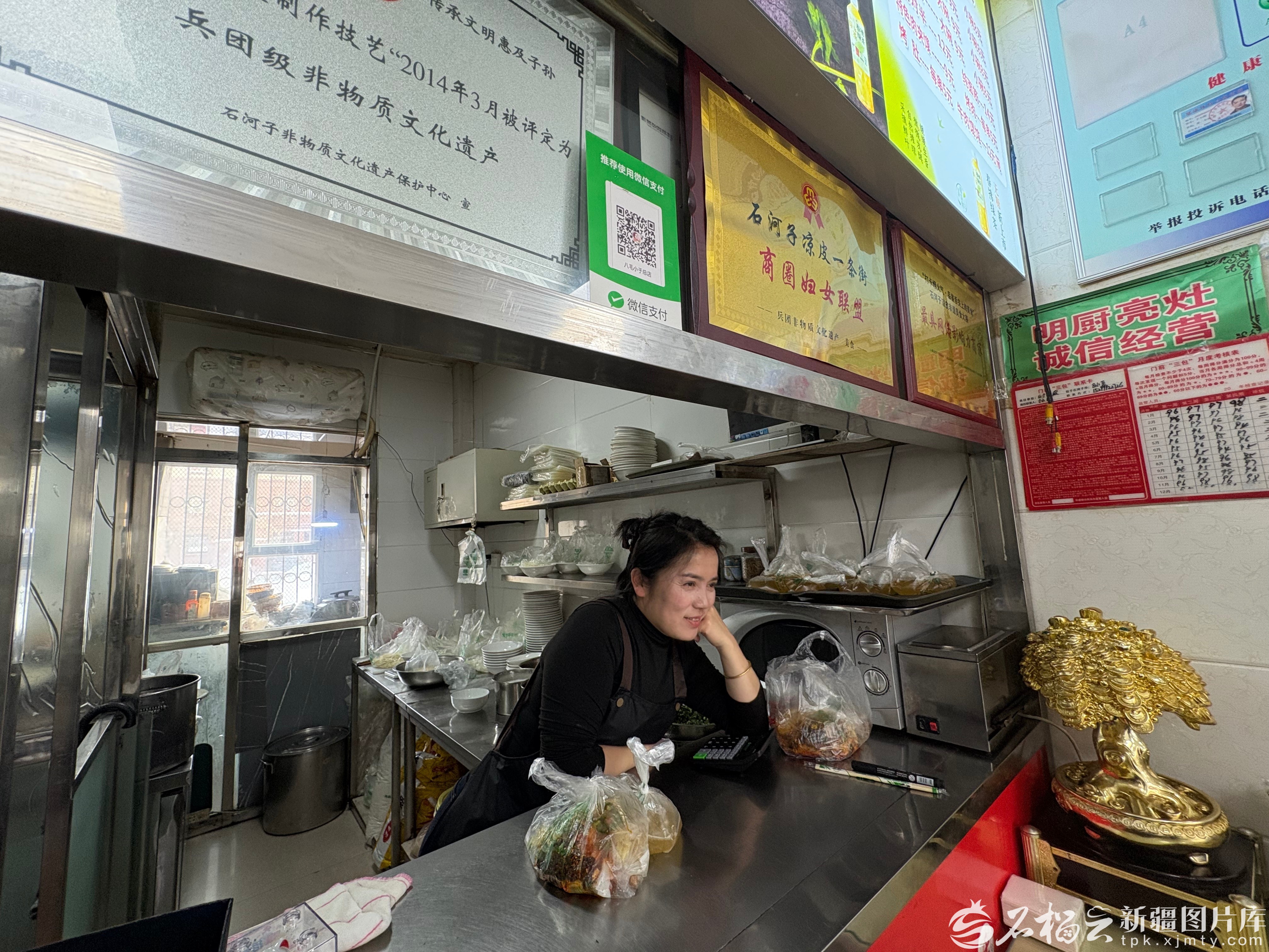 这家店是郭春娥从叔叔婶婶手里接下来的。早年,整条街只有两家店,家家都得自己动手洗凉皮。“十年前,石河子有了专门的凉皮厂,一下子轻松多了。”如今原料从工厂按需配送,品质稳定,还能根据顾客反馈调整。“我也算从灶台边‘解放’出来一点,有更多时间顾家、陪孩子了。”