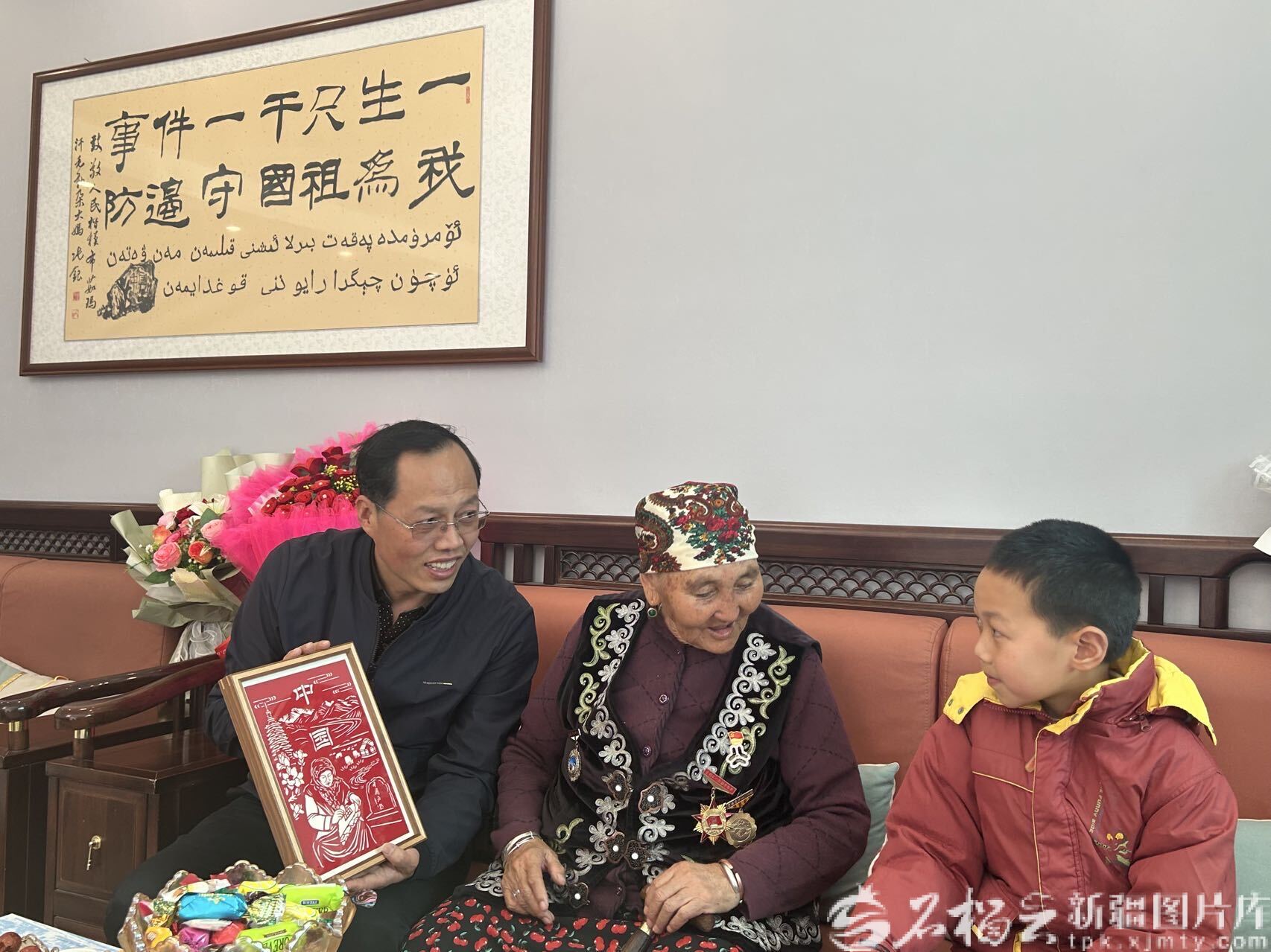 布茹玛汗·毛勒朵接过礼物,紧紧拉着仲熙睿的小手,笑着叮嘱:“谢谢孩子,你回去一定要告诉同学们,好好学习,长大做个对祖国有用的人。”仲熙睿仰着头,认真听着,用力点了点头。