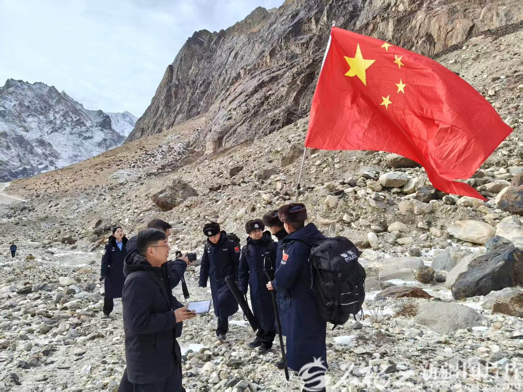 2月9日,天山托木尔峰下的夏特古道上,张治立(左一)在采访新疆出入境边防检查总站阿克苏边境管理支队破城子边境检查站的巡边民警。 冀江彤 摄