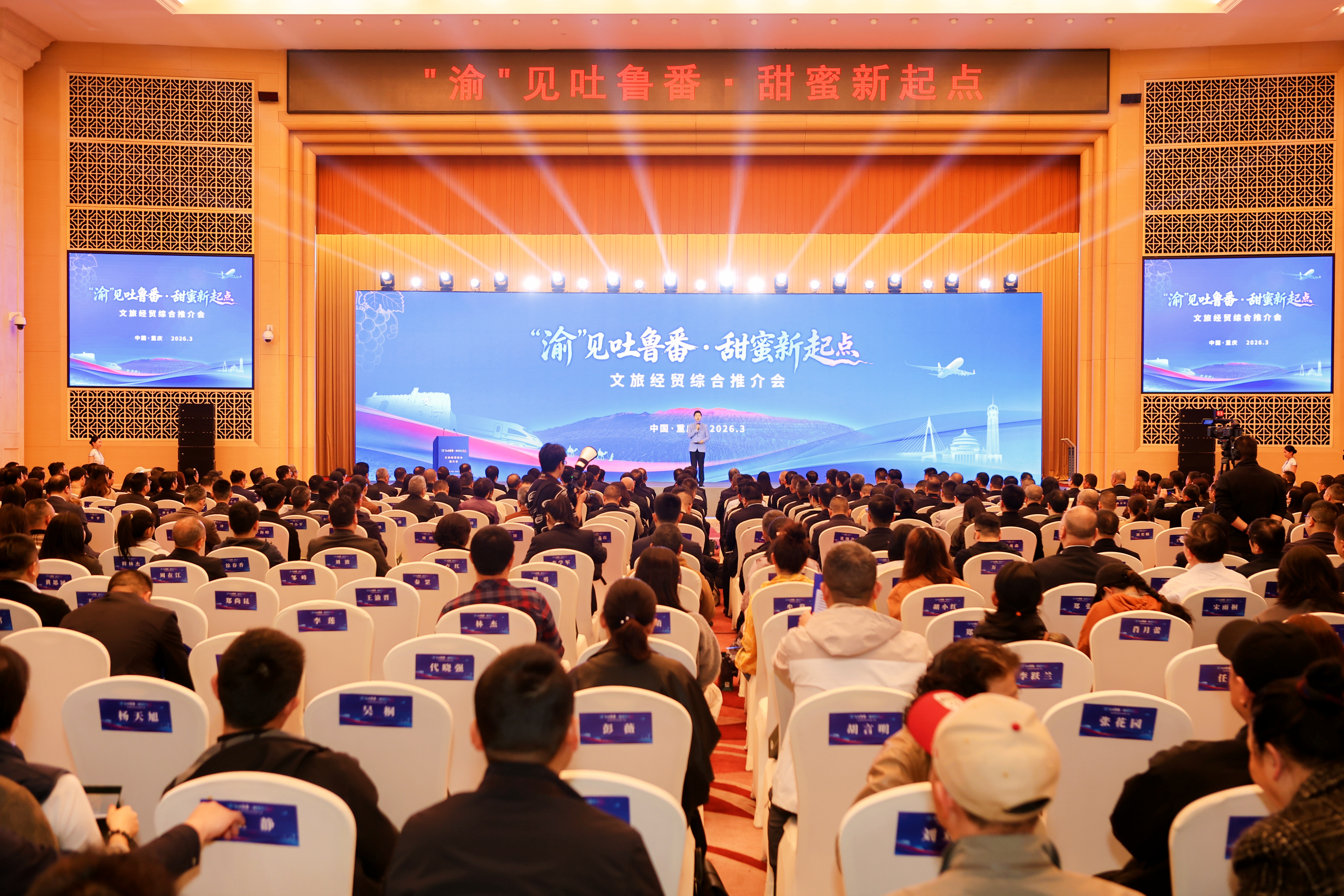 3月27日,“‘渝’见吐鲁番·甜蜜新起点”文旅经贸综合推介会在重庆举行。吐鲁番市委常委、常务副市长汤红杰,市委常委、副市长周亮,副市长陈岩岭分别围绕产业投资、文旅资源、矿产资源三大板块作专题推介,发布了总投资超1500亿元的城市机会清单,涵盖11大领域、106个项目。西部航空同步发布航线首航优惠政策,向川渝及全国500余家企业发出合作邀约。
