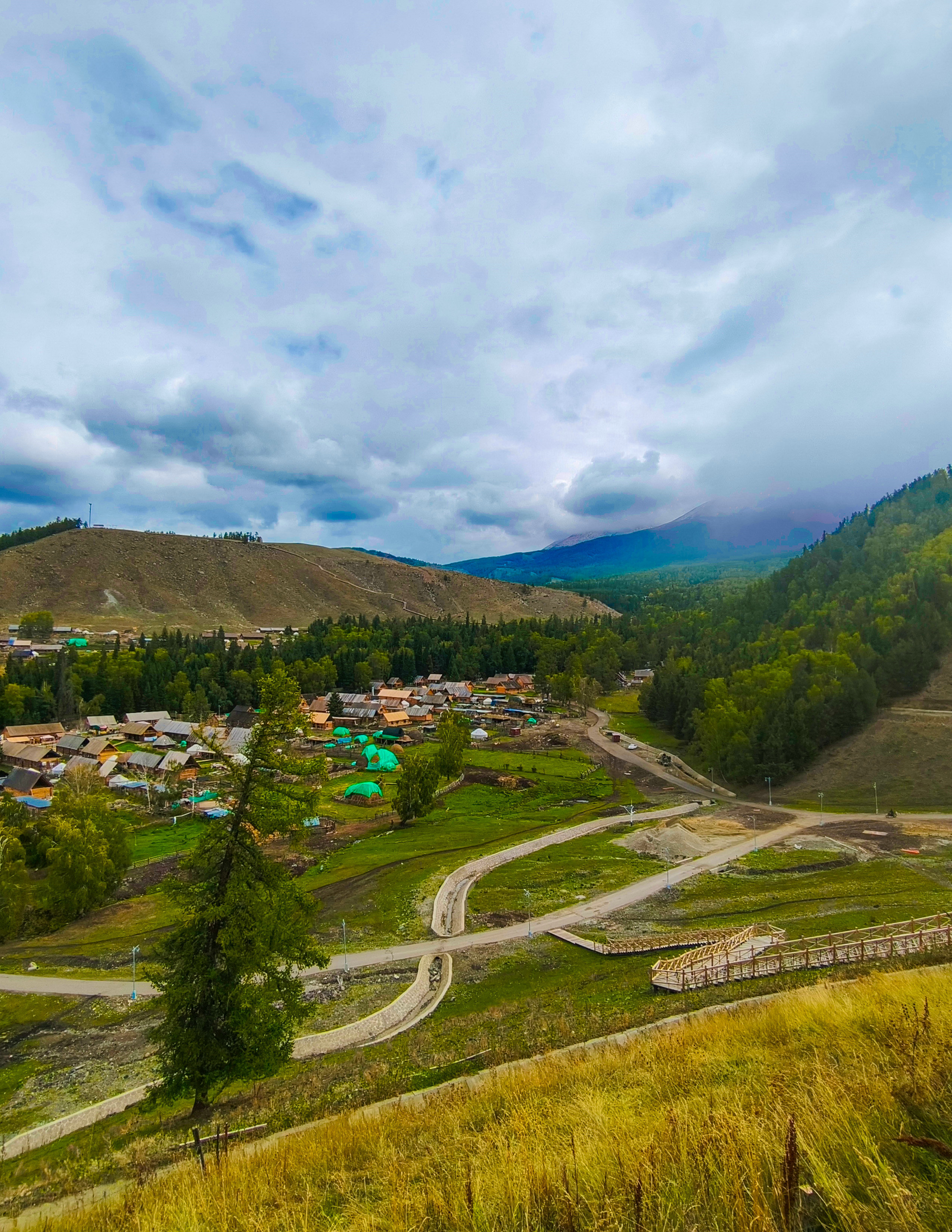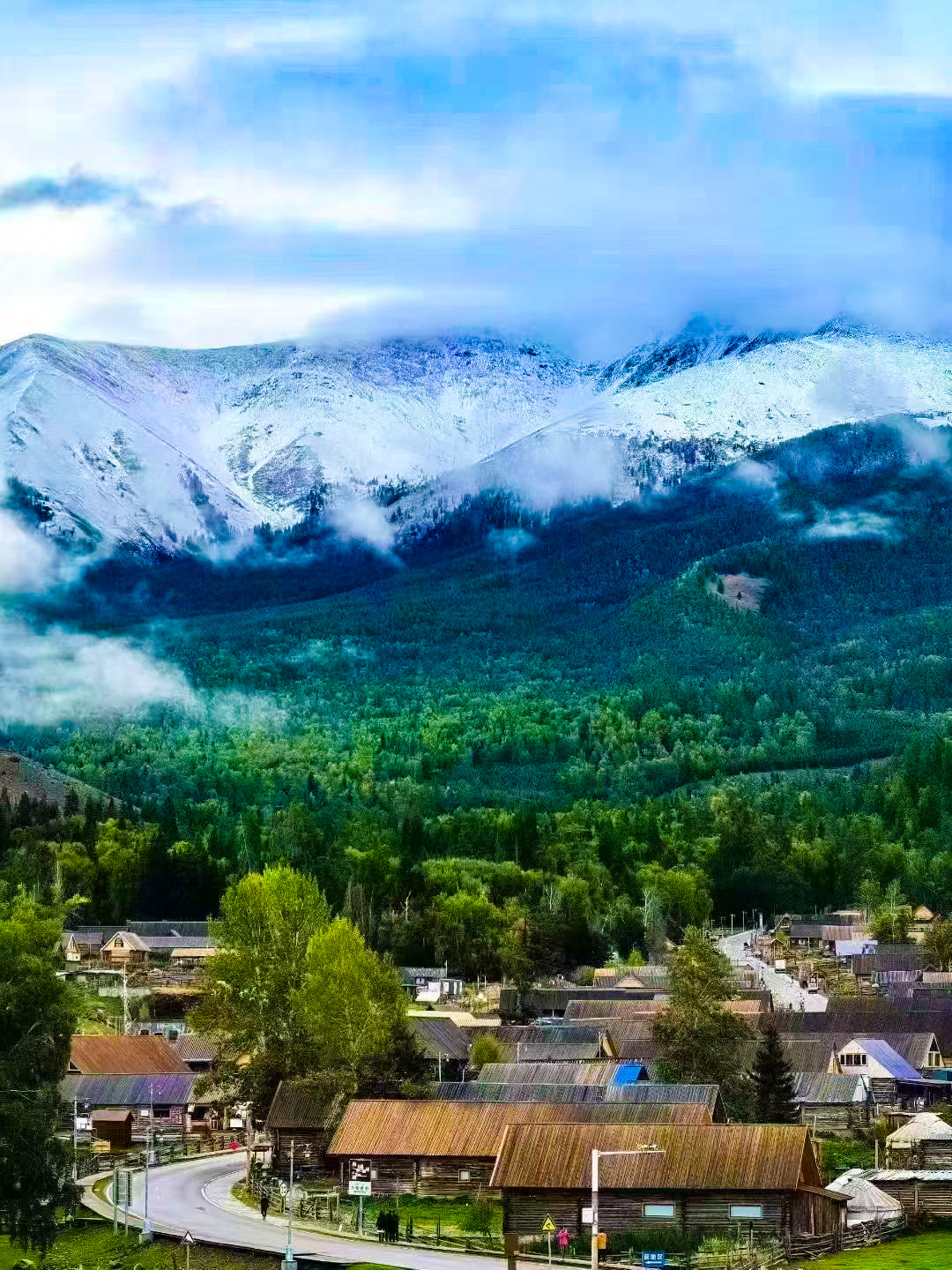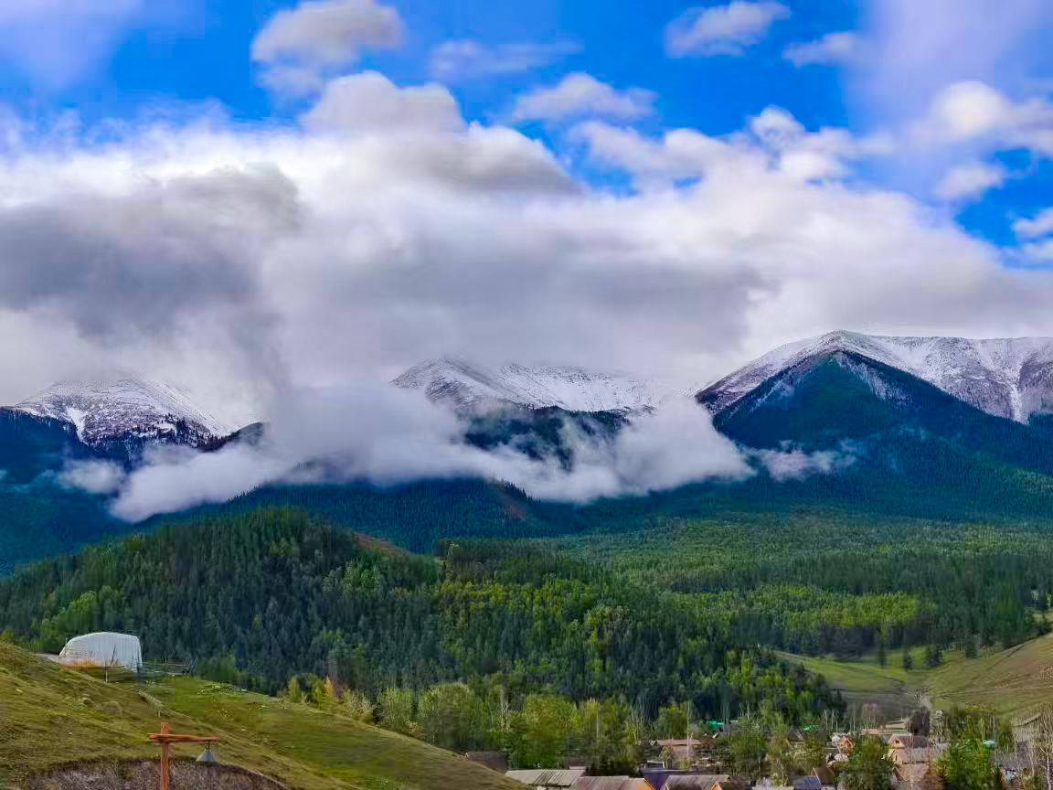 8月31日,新疆阿勒泰地区哈巴河县白哈巴村宛如世外桃源。蓝天白云下,雪山巍峨耸立,山间云雾缭绕,似轻纱般缠绕山腰,山脚下,森林郁郁葱葱,绿意盎然。白哈巴村的木屋错落有致,与自然环境和谐相融,静谧中透着古朴,仿佛一幅浑然天成的山水画卷。