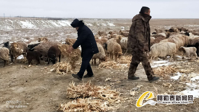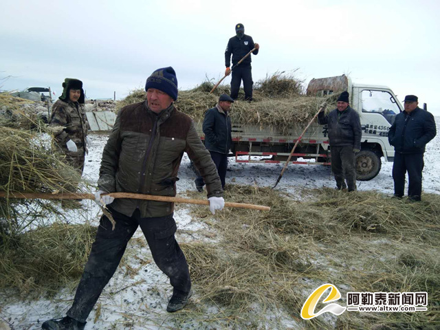 在得知牧民合孜尔别克·达拉依汗家的牲畜在转场途中也因恶劣天气无法觅食时,工作队队员及村“两委”班子成员又第一时间紧急从10余公里外调来饲草料,帮助哈孜别克渡过难关。