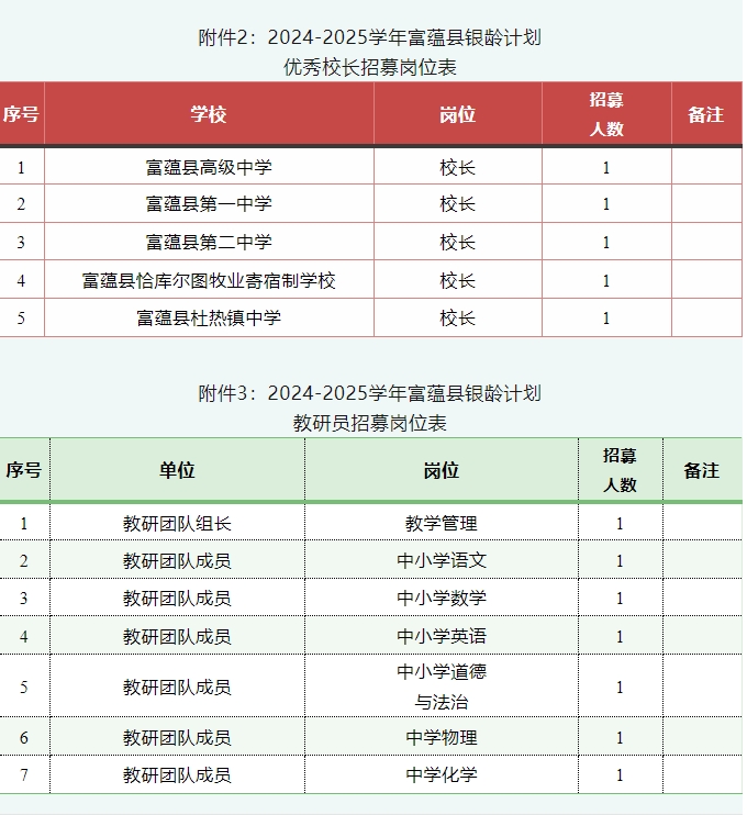 为深入贯彻落实国家银龄教师行动计划战略部署,根据《中共中央、国务院关于全面深化新时代教师队伍建设改革的意见》及《教育部等十部门关于印发<国家银龄教师行动计划>的通知》(教师〔2023〕6号)精神,富蕴县面向全国招募引进一批优秀退休校长、退休教师。现将有关事项公告如下: