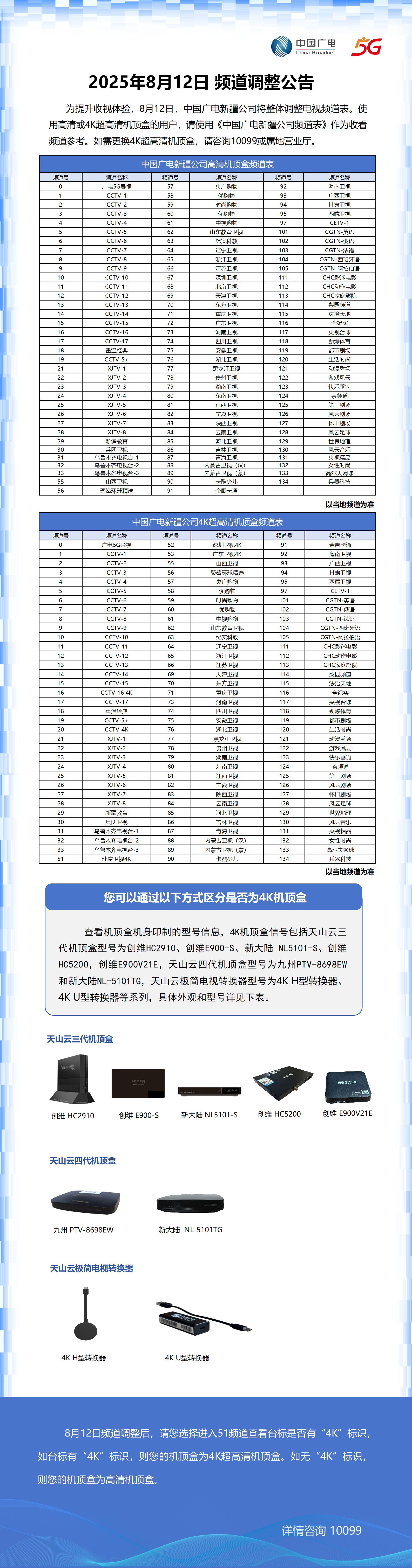 为提升用户收视体验及加快推进有线电视网络高清化进程,中国广电新疆公司将于8月12日凌晨对电视频道及排序进行调整,请重启机顶盒即可完成节目自动搜索。详询客服热线10099,广电“码上办”或属地营业厅。