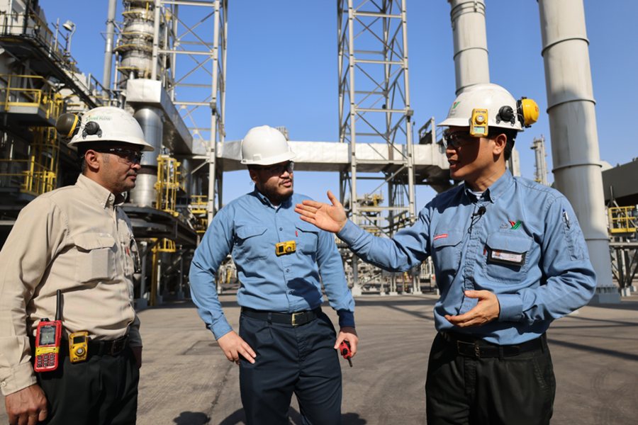2022年11月27日,在沙特西部城市延布,中沙延布炼厂的员工在交流。总投资86亿美元的中沙延布炼厂是中国石化与沙特阿拉伯石油公司合资兴建的项目,自2016年1月20日由两国元首共同启动投产以来,发展迅速。今年1月至8月累计实现利润11.5亿美元。