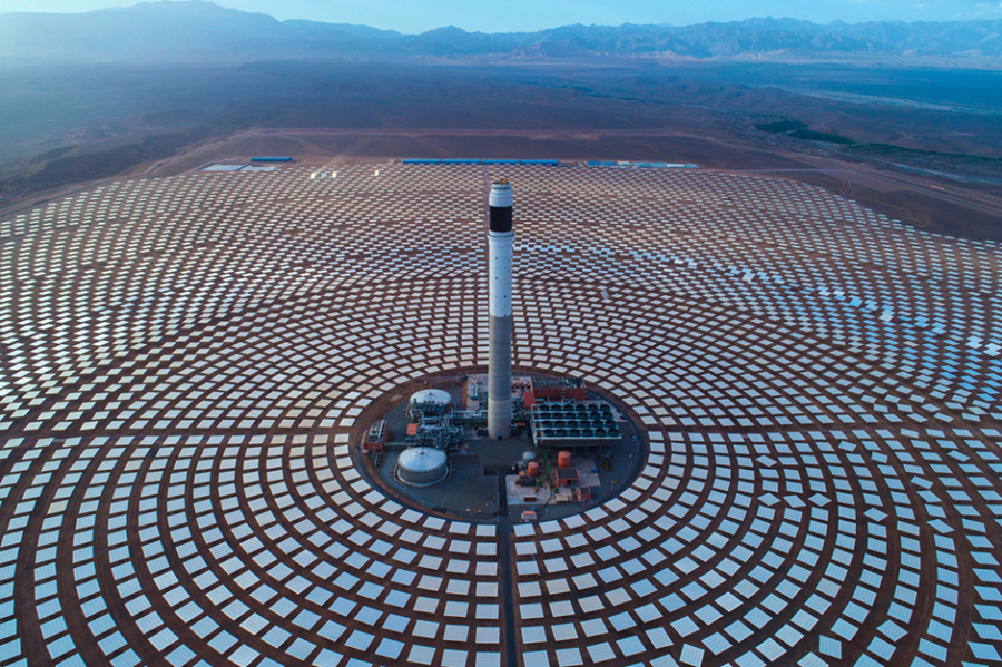 这是2018年6月7日在摩洛哥瓦尔扎扎特拍摄的努奥光热电站项目三期工程(航拍照片)。从2015年起,中国电建集团下属的山东电建三公司在瓦尔扎扎特承建努奥光热电站项目二期和三期工程。努奥光热电站为超过百万的摩洛哥家庭提供清洁能源。