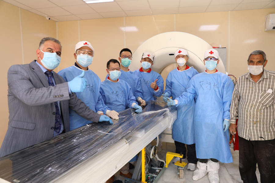 2020年4月12日,在伊拉克首都巴格达,援助伊拉克防治新冠肺炎的中国医疗专家将CT设备搬运到机房后与伊方人员合影。