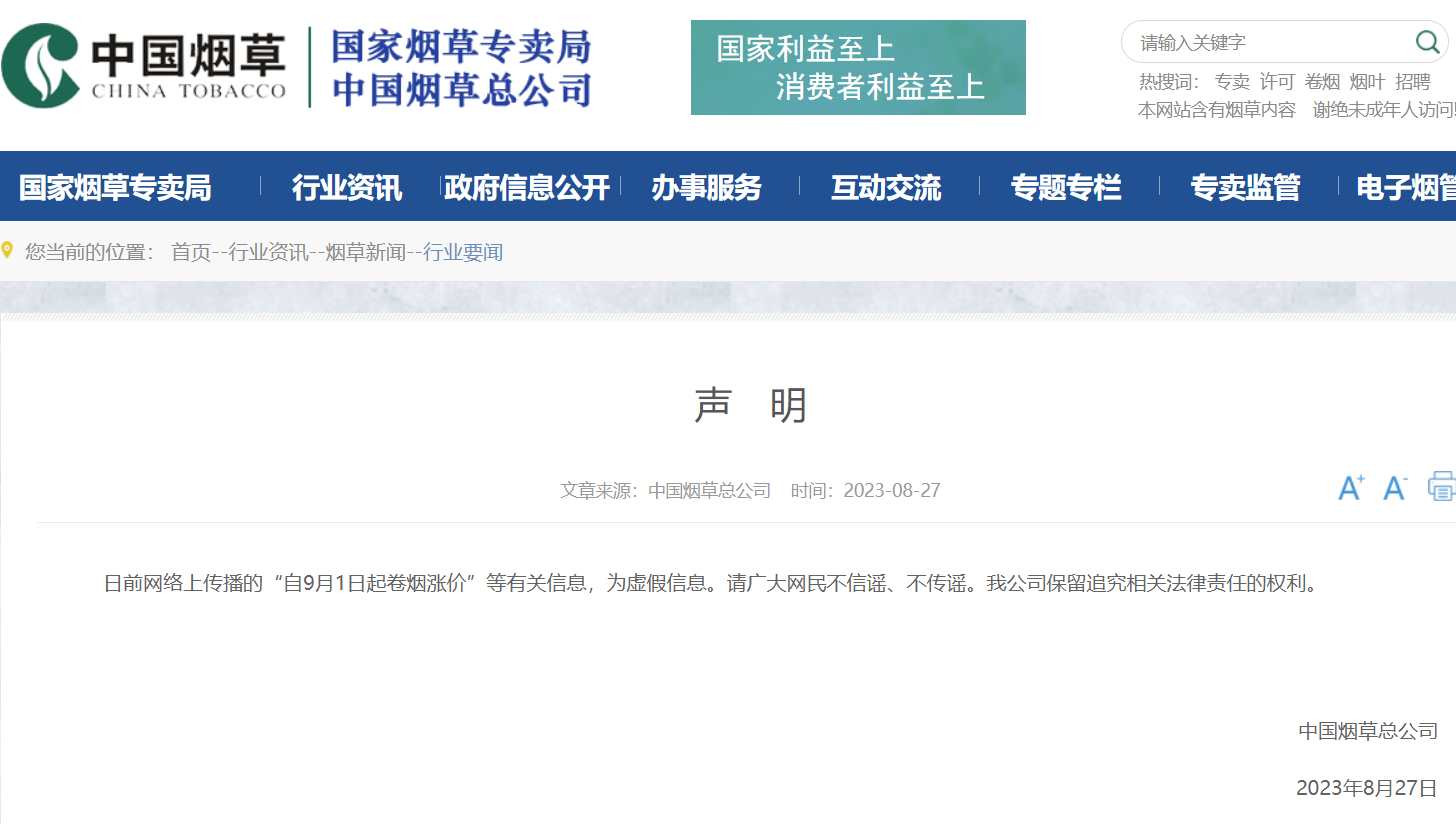 网传“自9月1日起卷烟涨价”,中国烟草总公司辟谣
