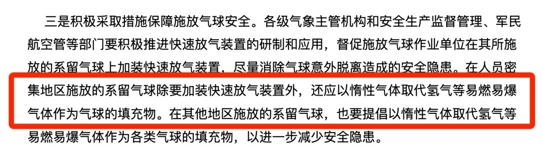在 2006 年 7 月,中国气象局、中国民航总局、国务院中央军委空中交通管制委员会办公室联合下发了《关于进一步加强施放气球安全管理工作的通知》,其中也呼吁用惰性气体取代氢气等易燃易爆气体。