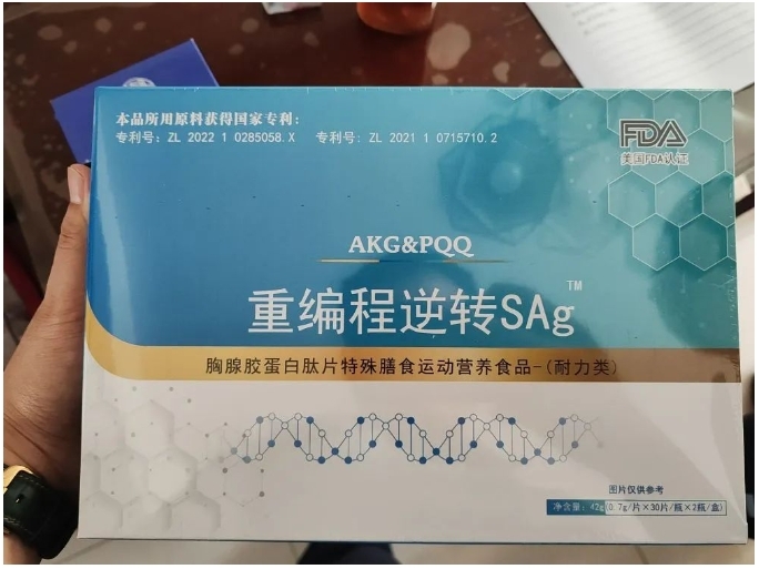 记者了解到,团伙推销的产品名为“重编程逆转SAg”(胸腺胶蛋白肽片),王某某号称使用后可以逆转身体内的细胞,进而达到逆生长状态,针对糖尿病、心脏病、老年痴呆、癌症等疾病具有显著功效。