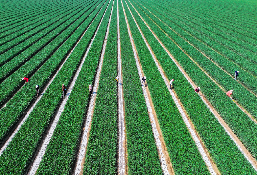 4月20日,在山东省东营市广饶县李鹊镇拐子村的田地里,农民在为覆膜的春玉米打孔(无人机照片)。新华社发(刘云杰摄)