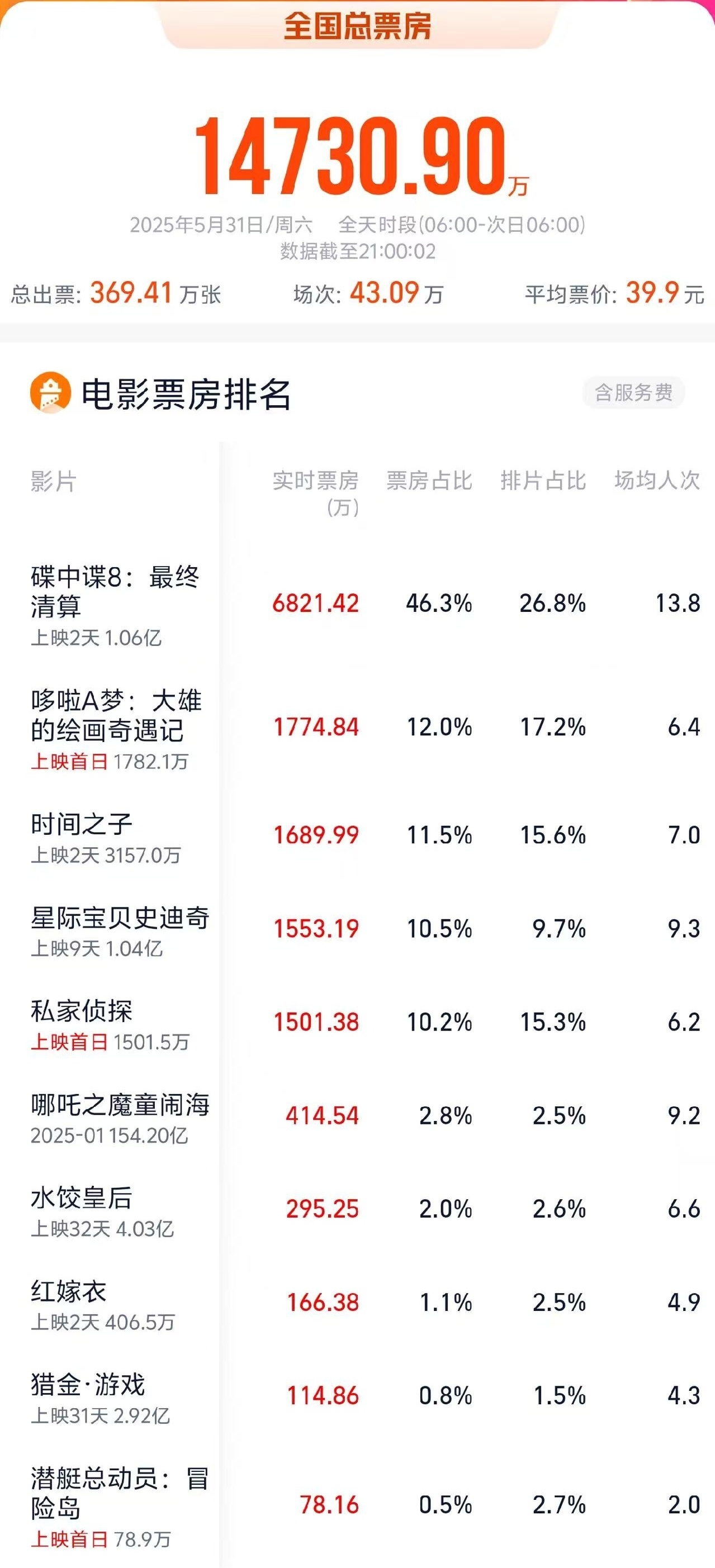 据网络平台数据,截至5月31日21时,2025年端午档首日票房1.47亿。