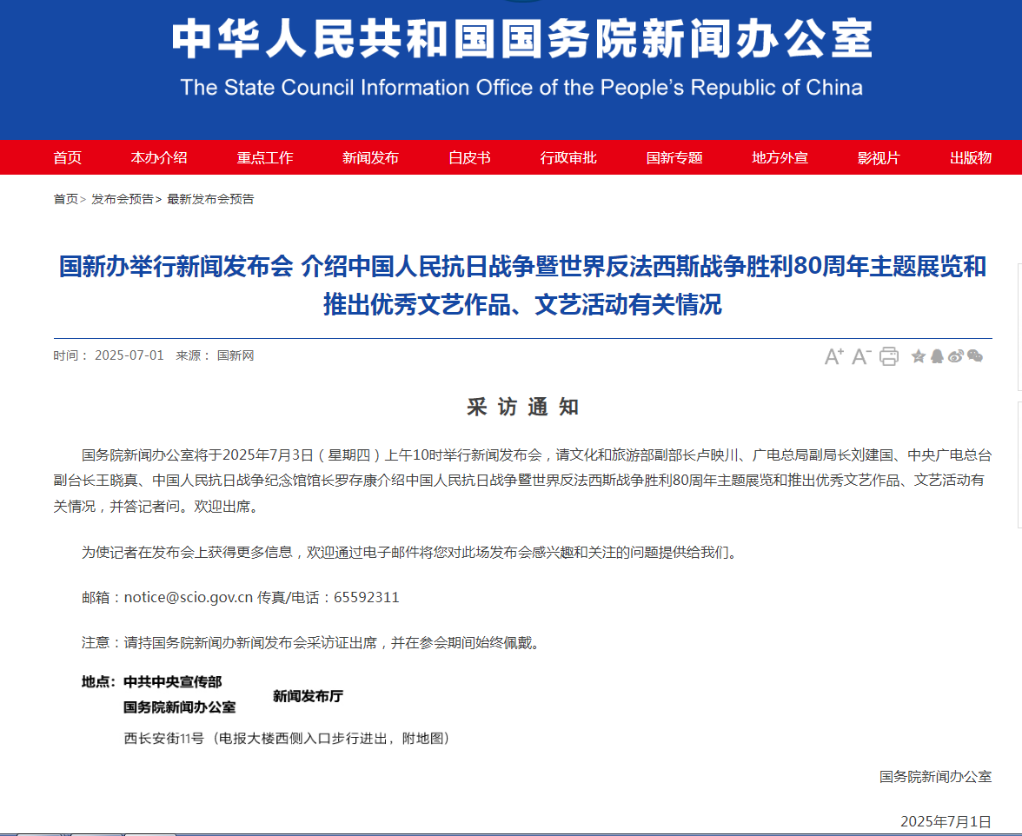 国务院新闻办公室将于2025年7月3日(星期四)上午10时举行新闻发布会,请文化和旅游部副部长卢映川、国家广电总局副局长刘建国、中央广电总台副台长王晓真、中国人民抗日战争纪念馆馆长罗存康介绍中国人民抗日战争暨世界反法西斯战争胜利80周年主题展览和推出优秀文艺作品、文艺活动有关情况,并答记者问。(记者 王子铭)