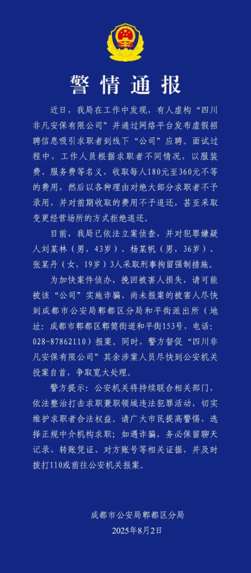 近日,成都公安连续破获两起虚假招聘诈骗案件,相关涉案人员及行为已被公安机关依法查处。