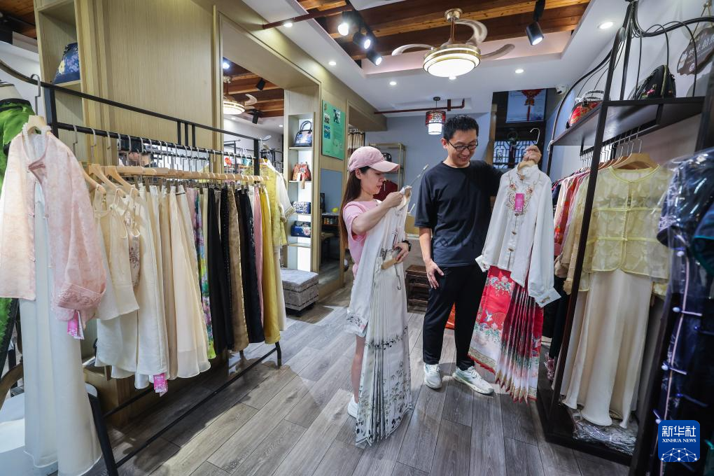 8月26日,游客在嘉兴市南湖区月河历史街区的一家店里挑选传统服饰。新华社记者 徐昱 摄
