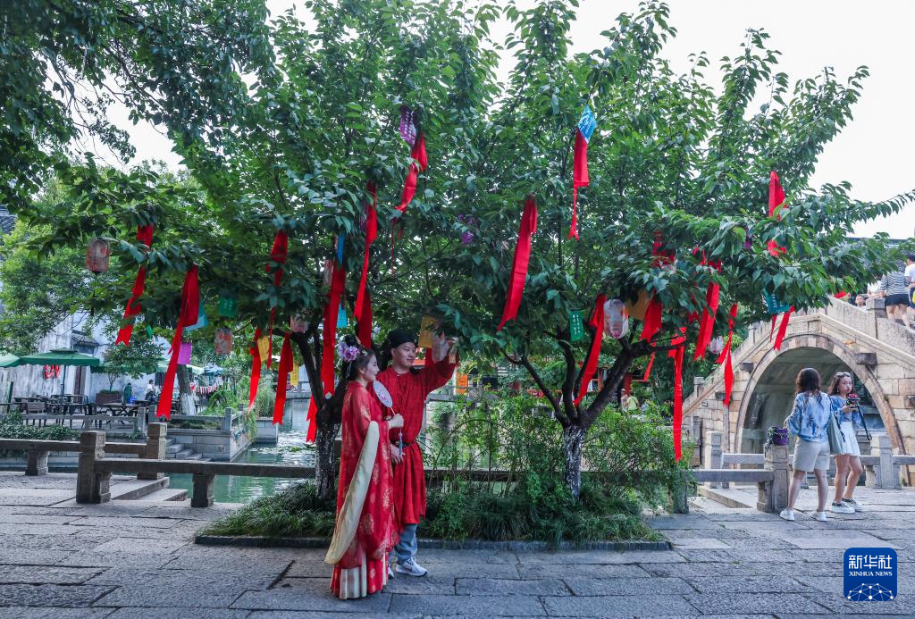8月26日,在嘉兴市南湖区月河历史街区,游客身着传统服饰在七夕许愿树下拍照。新华社记者 徐昱 摄
