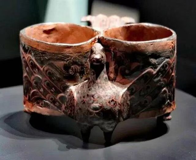 譬如现藏于湖北省博物馆的战国彩绘漆木凤鸟双联杯,1987年出土于湖北省荆门市包山2号墓,是古代合卺杯的代表。此杯整体为一鸟负双杯状,前端为头颈,后端出尾翼,中部并列两个桶形杯,杯之间有孔相通。杯子的凤鸟形状经雕刻而成,口中衔有一珠。为了使双联杯放置时更稳定,杯侧后部各有一凤开屏形状的杯足。凤鸟的头、颈、胸、尾遍刻象征羽毛的鳞状纹,全身除尾翼底面为红漆外,其他均髹黑漆,再用红、黄、金色绘勾连纹、圆圈纹、卷云纹等。此外,凤鸟首、腹和羽翅共嵌有银色宝石8颗,更显华贵俏美、身份不凡。凤鸟自古都是吉祥、富贵的象征,而合卺杯系新婚夫妇行合卺之礼所用的酒杯,也就是“交杯酒”的用具。战国彩绘漆木凤鸟双联杯造型奇特、雕刻细致,用漆工艺精湛,彩绘艺术高超,寓烂漫与写实于一体,属于先秦漆木工艺的杰作。