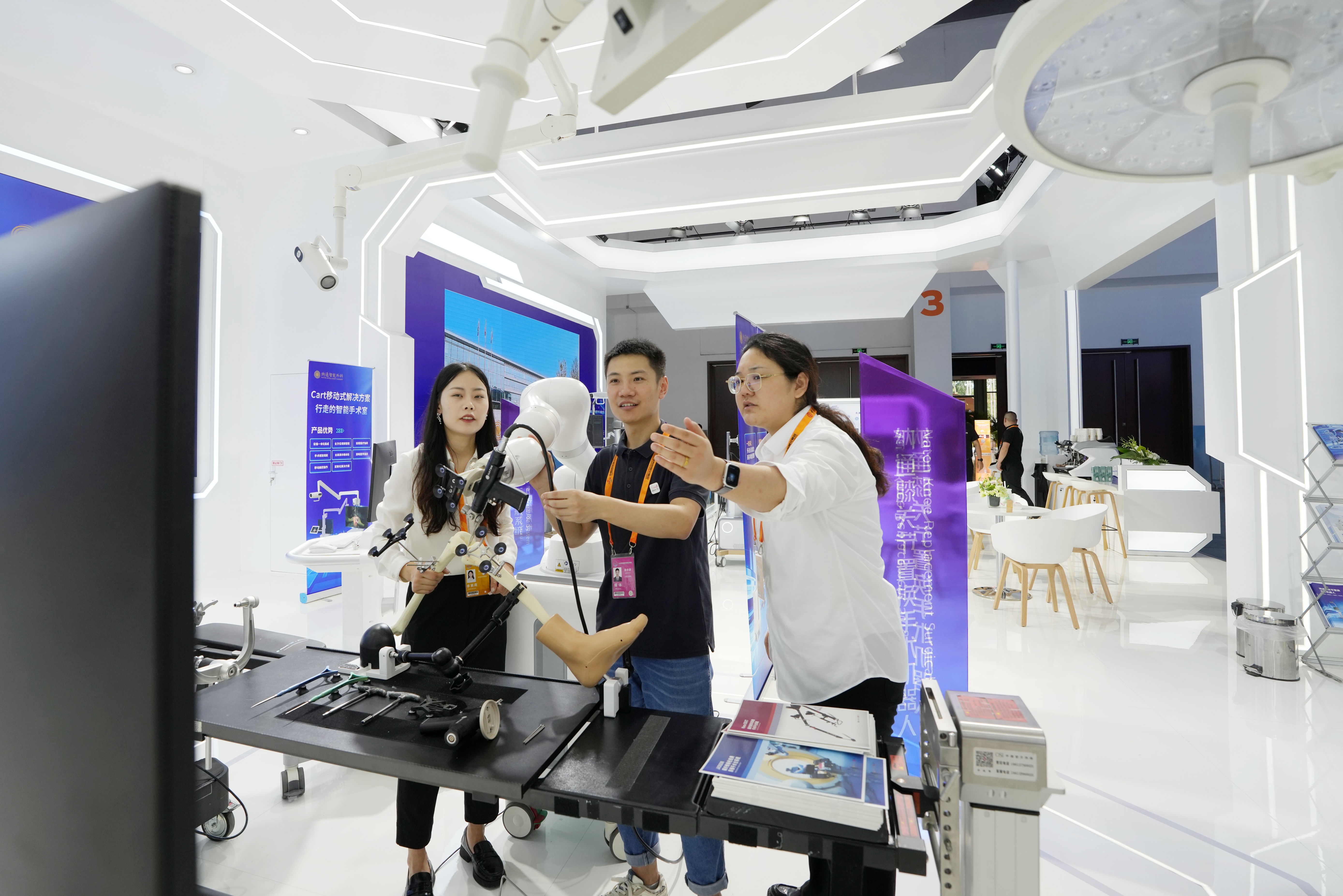 9月11日,一位媒体记者(中)在2024年服贸会国家会议中心会场体验北京纳通科技集团有限公司的膝关节置换手术机器人。新华社记者鞠焕宗 摄