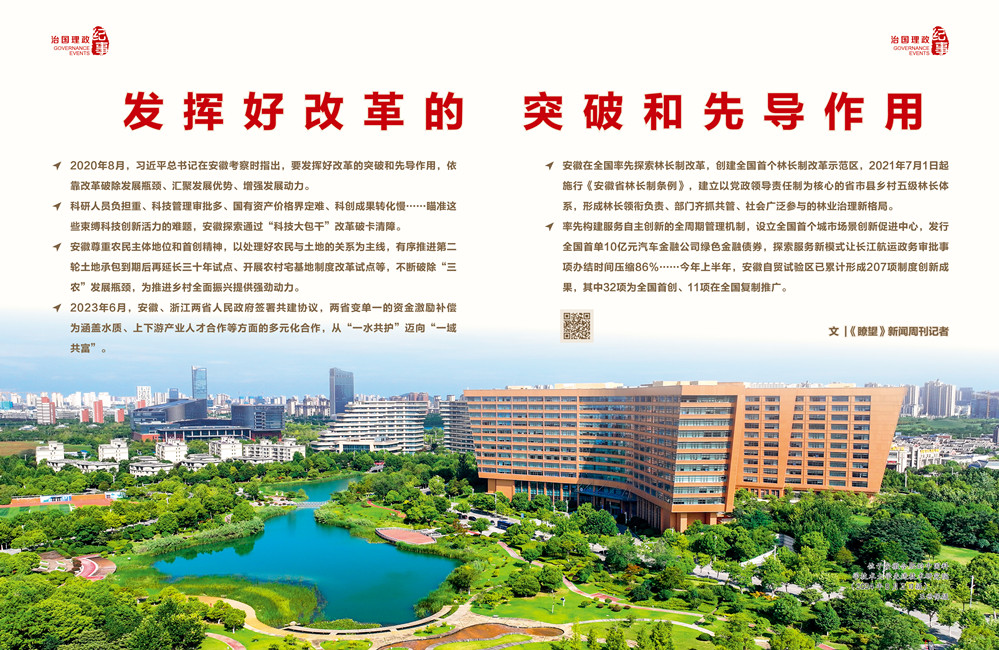 锚定现代化、改革再深化。今年9月,安徽省委十一届七次全会审议通过《中共安徽省委贯彻落实〈中共中央关于进一步全面深化改革、推进中国式现代化的决定〉的意见》。这份“安徽版”改革方案目标明确为“六个新提升、六个当先锋”:打造具有重要影响力的科技创新策源地实现新提升,在高水平创新型省份建设上当先锋;打造具有重要影响力的新兴产业聚集地实现新提升,在因地制宜发展新质生产力上当先锋;打造具有重要影响力的改革开放新高地实现新提升,在落实国家重大战略上当先锋;打造具有重要影响力的经济社会发展全面绿色转型区实现新提升,在生态文明建设上当先锋;促进社会公平正义实现新提升,在增进人民福祉上当先锋;党的建设质量实现新提升,在践行“三严三实”上当先锋。