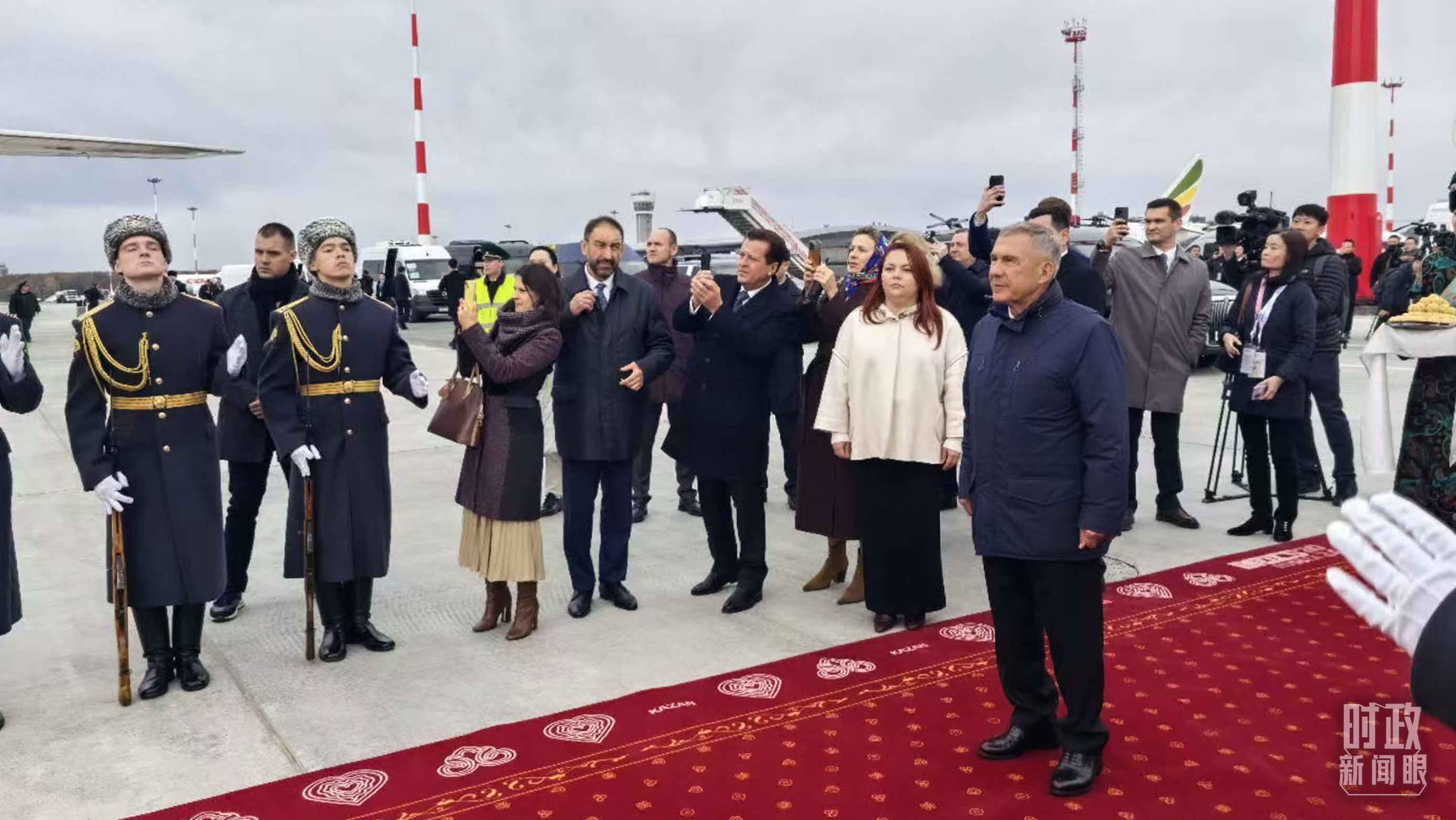 △ 习主席专机抵达喀山国际机场时,俄罗斯联邦鞑靼斯坦共和国行政长官等在机场热情迎接。(总台央视记者王鹏飞拍摄)