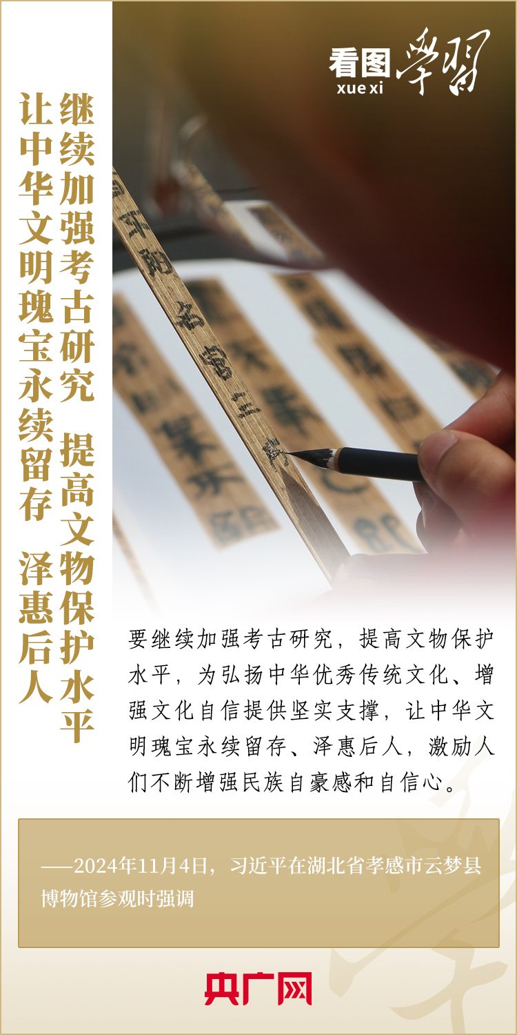 11月4日,习近平总书记在湖北省孝感市云梦县博物馆参观出土秦汉简牍展。这里收藏的我国考古史上首次发现的秦简——云梦睡虎地秦简,反映了战国晚期到秦始皇时期的政治、经济、文化、法律、军事等方面的情况。习总书记详细听取简牍内容、历史文化价值和保护研究情况介绍,指出要继续加强考古研究,提高文物保护水平,让中华文明瑰宝永续留存、泽惠后人。