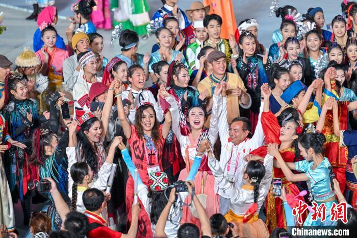 晚霞夕照,夜幕降临。在亚沙公园一期指环广场,伴随歌舞《同心圆》上演,紧扣“民族大联欢·天涯共此时”这一主题的文艺演出拉开帷幕。