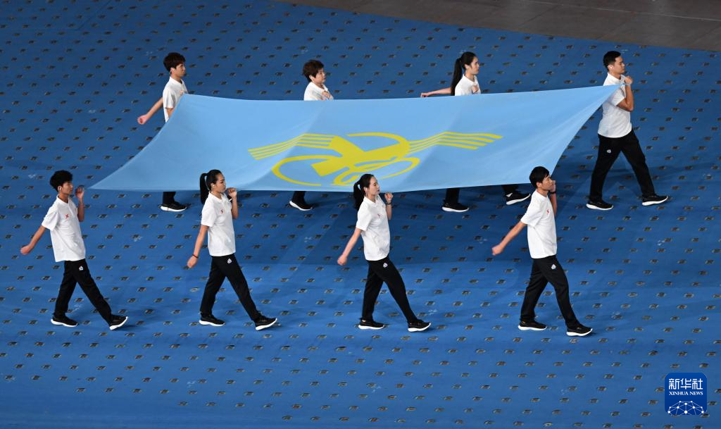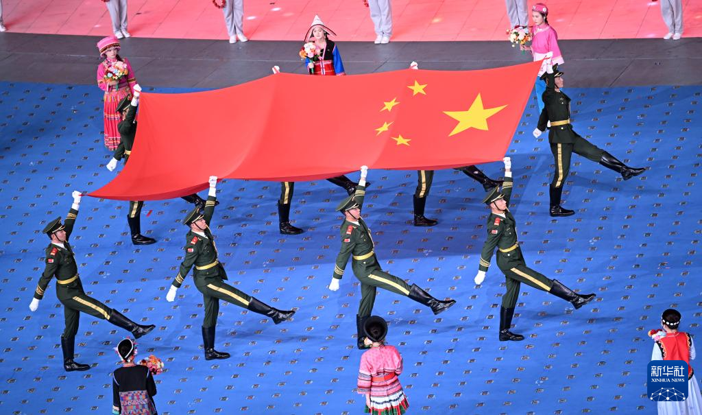 11月22日,中华人民共和国少数民族传统体育运动会会旗在开幕式上入场。新华社记者 孙凡越 摄