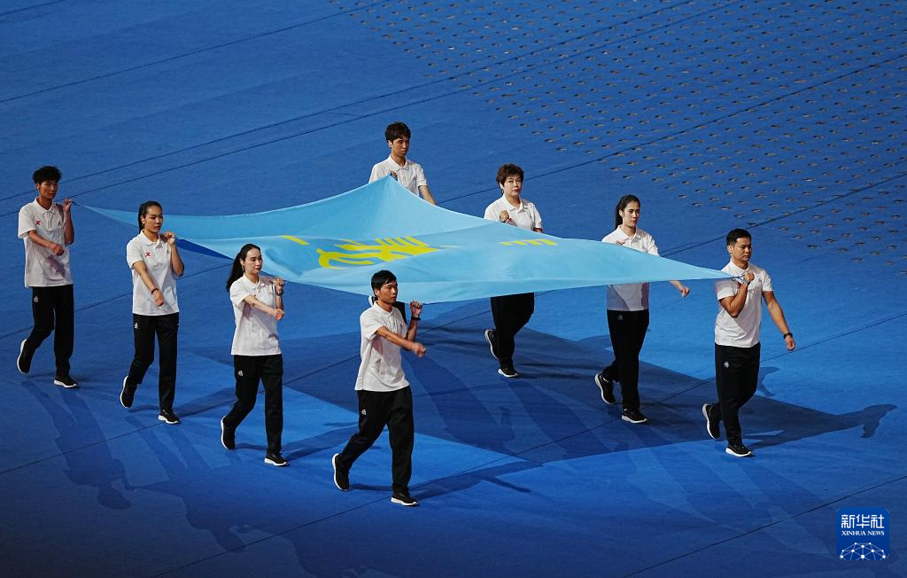11月22日,中华人民共和国少数民族传统体育运动会会旗在开幕式上入场。新华社记者 胡超 摄