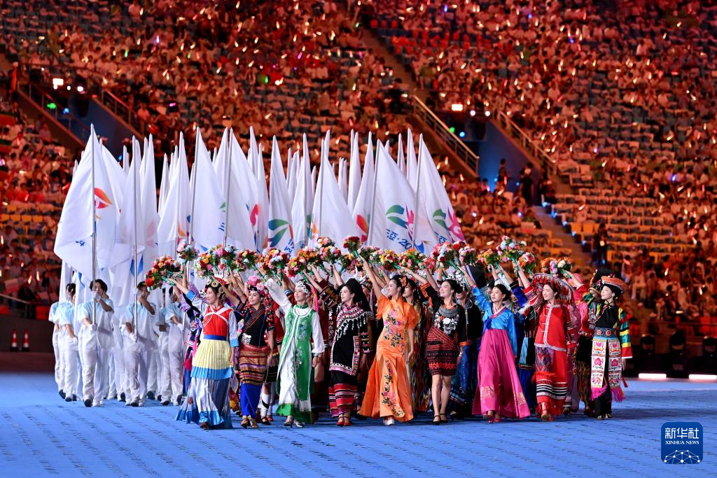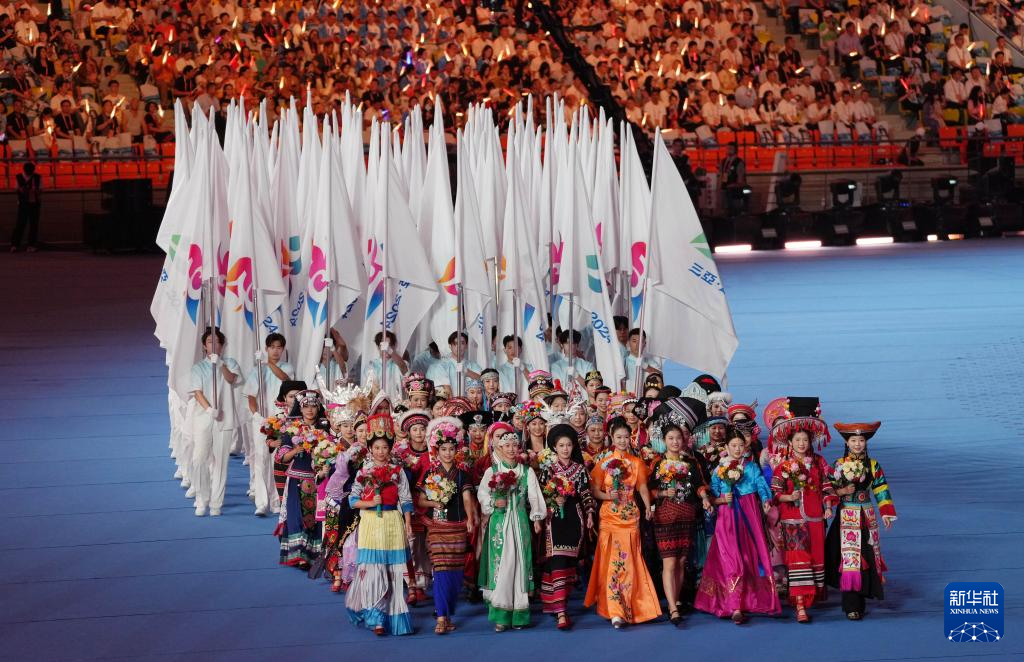 11月22日,中华人民共和国第十二届少数民族传统体育运动会会旗方阵在开幕式上入场。新华社记者 孙凡越 摄