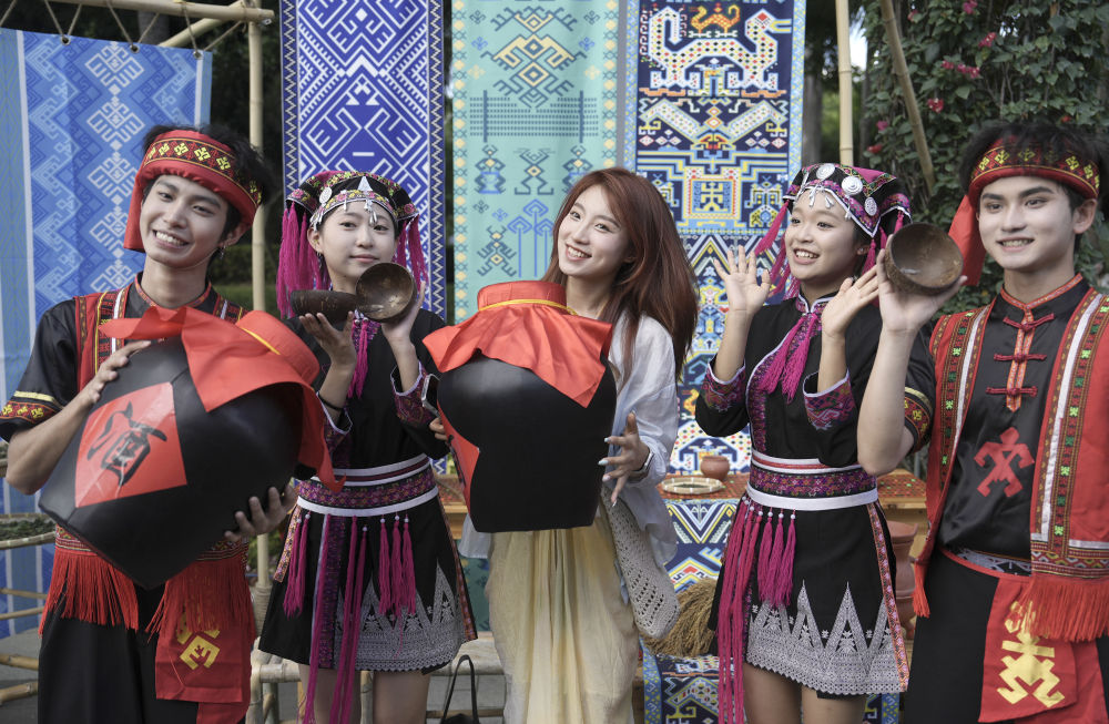 ↑台湾少数民族代表团和云南代表团成员在活动现场合影。新华社记者 周牧 摄