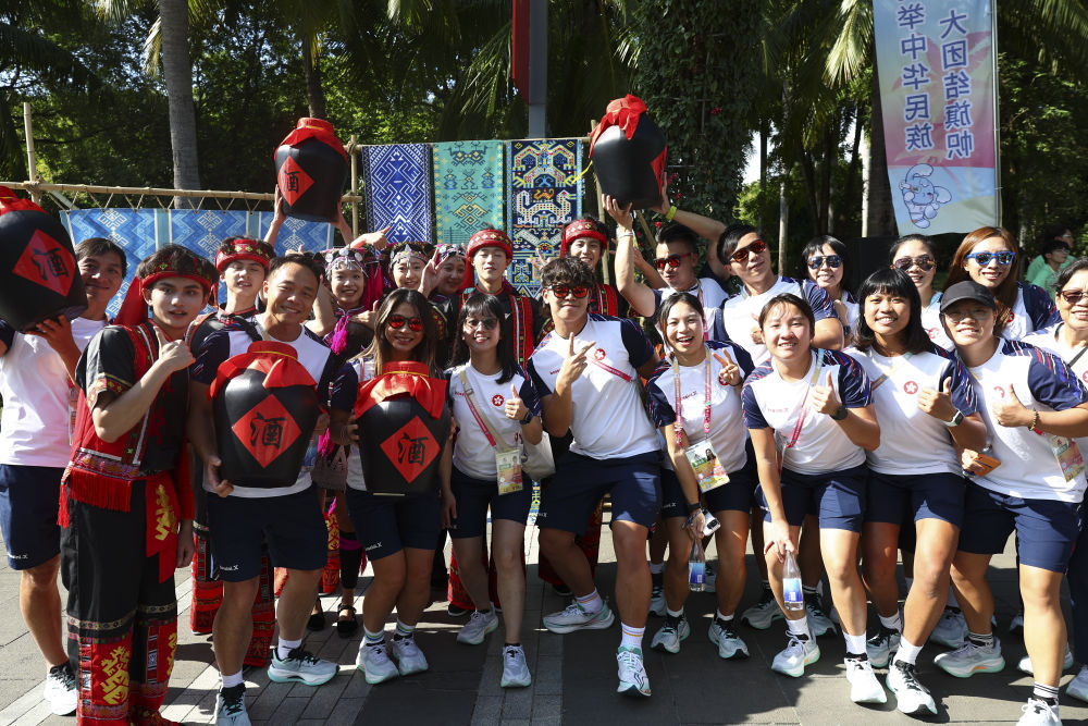 ↑西藏代表团运动员次旺曲珍(右二)和香港代表团运动员卢善衡(左二)在活动中互赠礼物。新华社记者 陈朔 摄