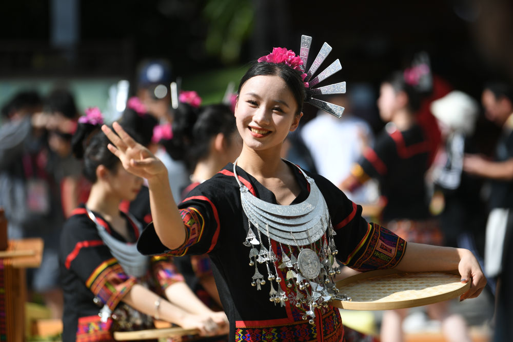 ↑演员欢迎广西代表团成员参加活动。新华社记者 孙凡越 摄