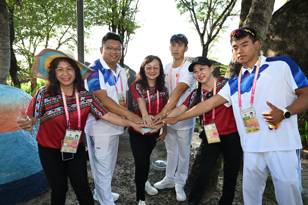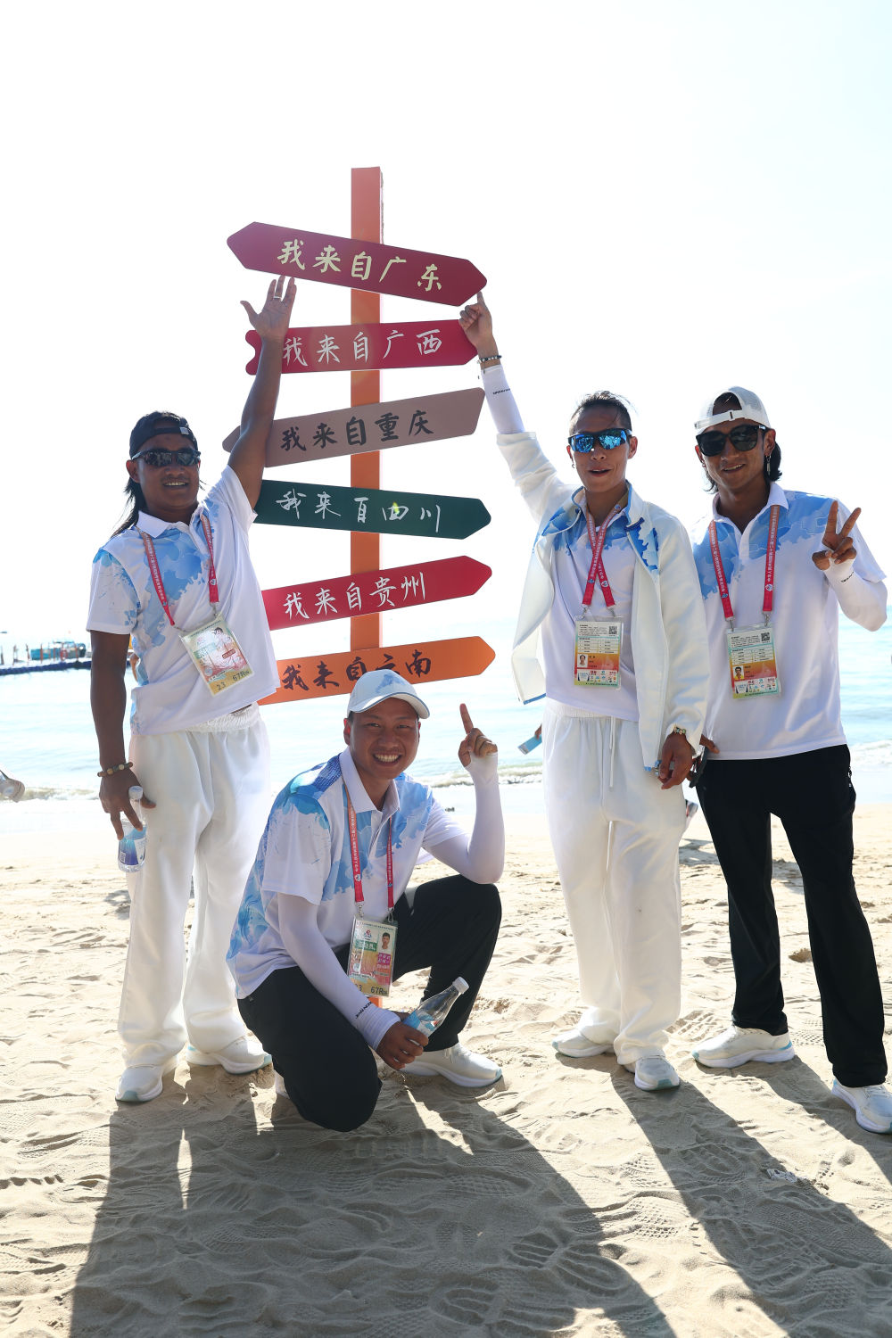 ↑运动员在游艺区体验沙滩排球。新华社发(杜笑微摄)