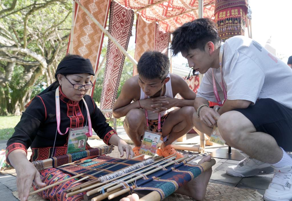 11月26日,演员(左)在活动中为代表团成员展示黎族传统纺染织秀技艺。当日,第十二届全国少数民族传统体育运动会民族大联欢活动在海南省三亚市举行。新华社记者 胡超 摄