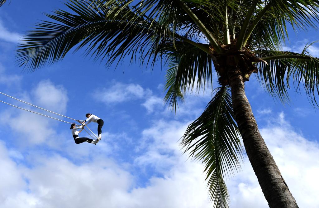 11月24日,上海队组合刘雨诺/张涵瑾(左)在比赛中。当日,第十二届全国少数民族传统体育运动会秋千55公斤以上双人高度决赛在海南三亚举行。新华社记者 王晓 摄