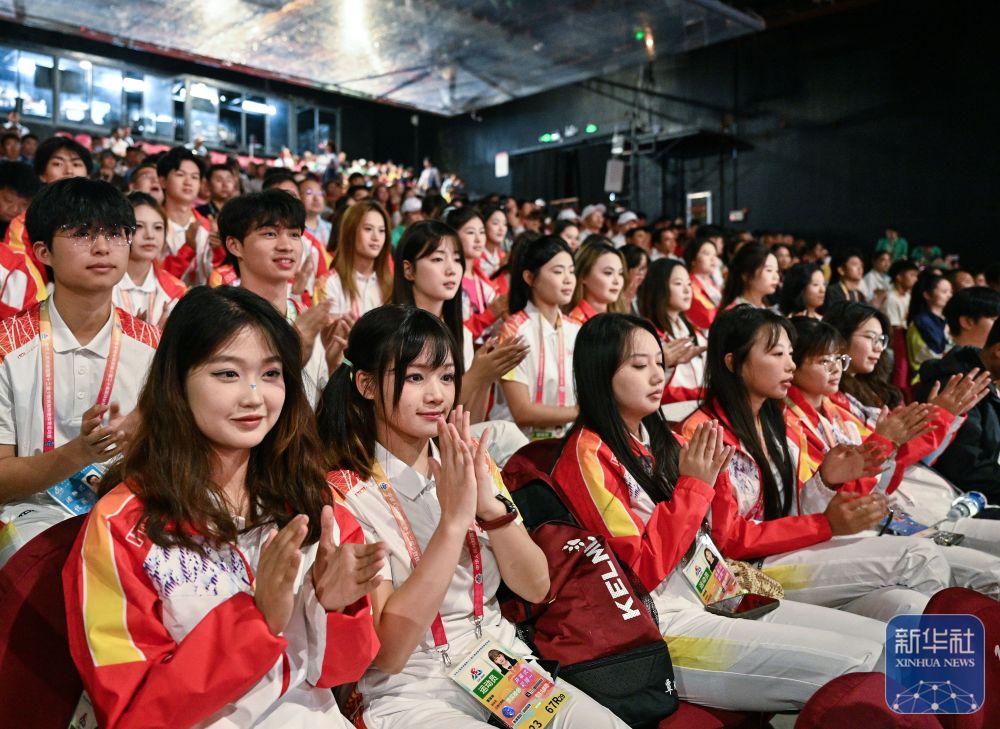 ↑运动员在现场观看表演。