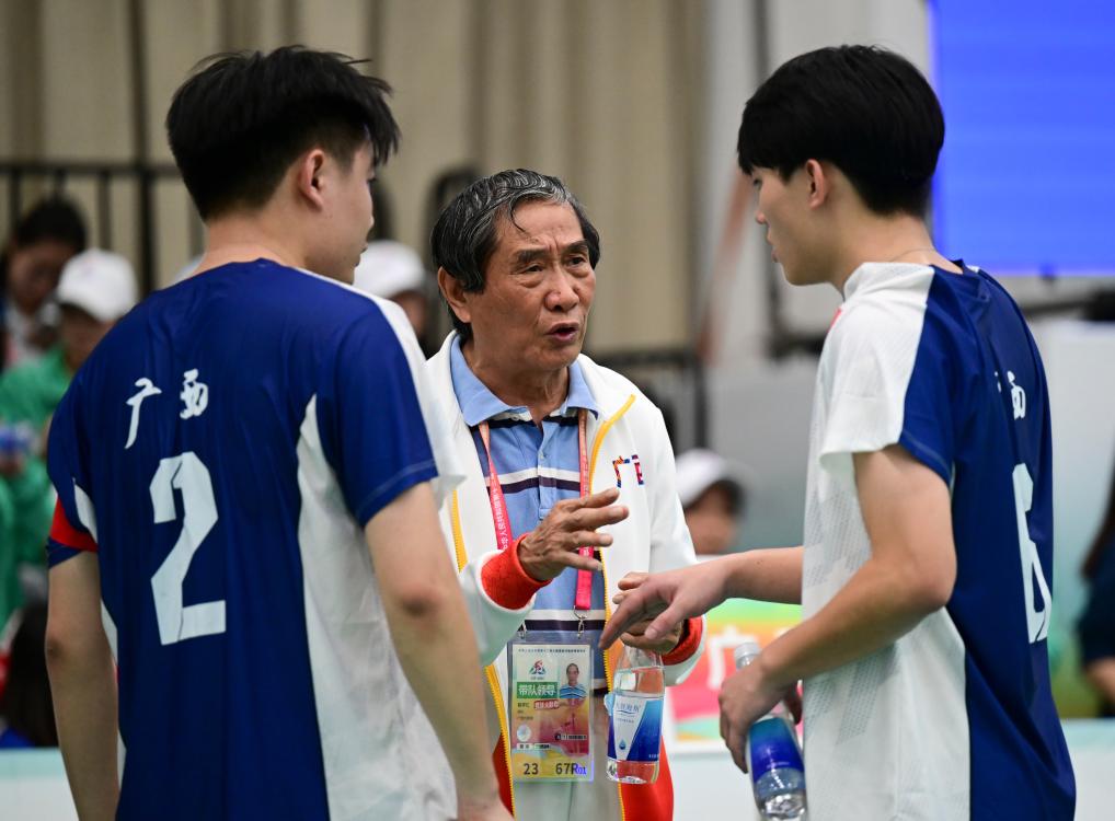 11月28日,广西队组合古志胤(左)/左铮(右)在比赛间隙接受教练陆学仁的指导。他们获得第十二届全国少数民族传统体育运动会毽球项目男子双人赛一等奖。新华社记者 周牧 摄
