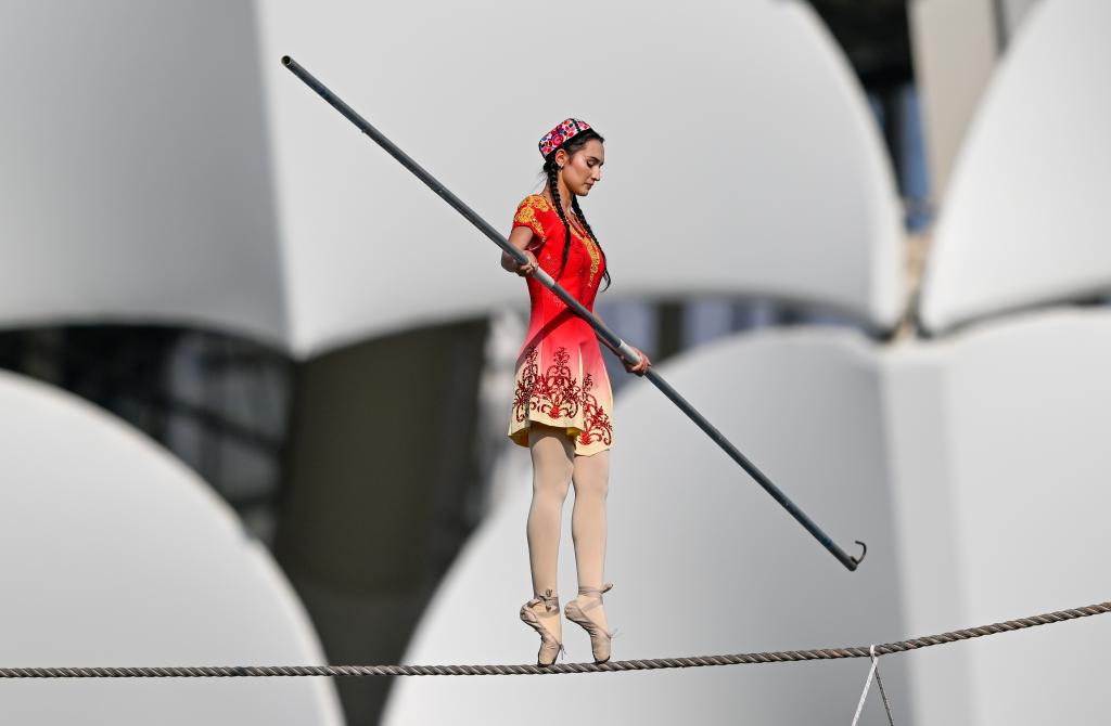 42年前,年仅11岁的阿迪力第一次参加运动会,默默看着师傅和前辈表演达瓦孜。今年他带着团队共同演绎的穿高跟鞋走钢丝、蒙眼走钢丝、钢丝上跳舞、钢丝上骑独轮车等等成为全场焦点。