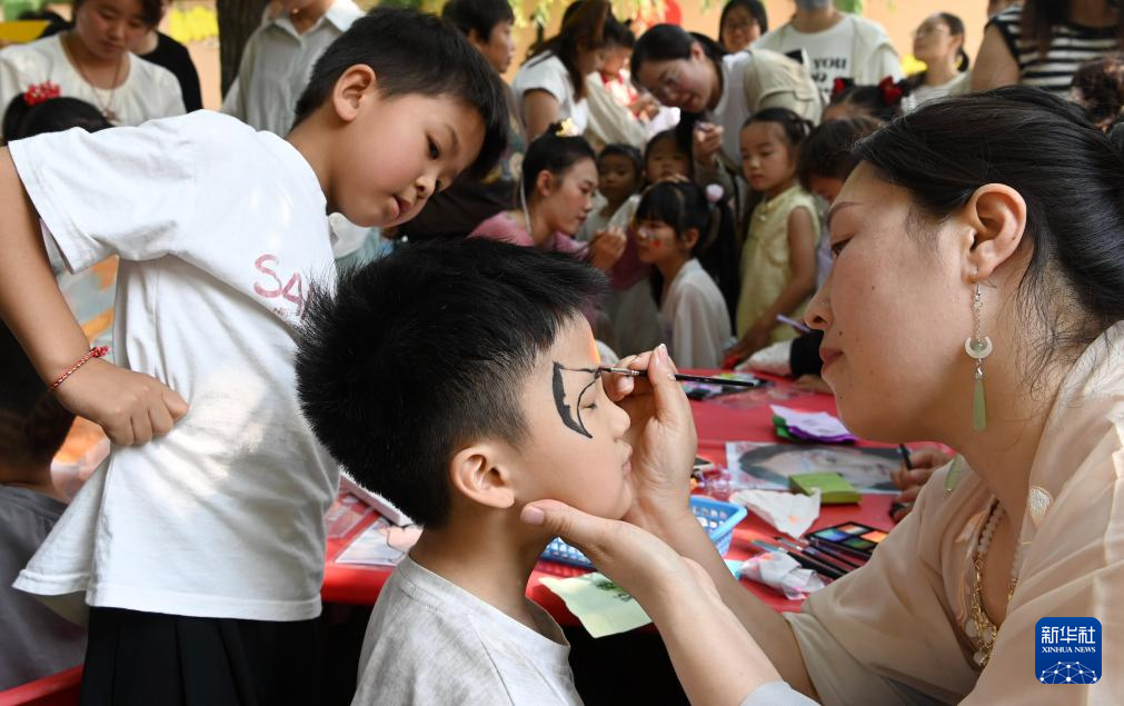 5月28日,在河南省沁阳市白庄村幼儿园,老师为小朋友画面部彩绘。新华社发(杨帆摄)