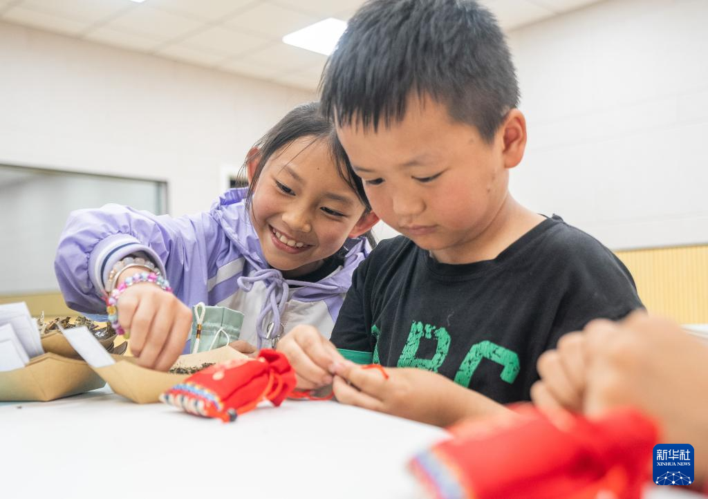 5月27日,贵州省毕节市七星关区甘河街道中心校的孩子们在老师指导下制作香囊。新华社发(罗大富摄)