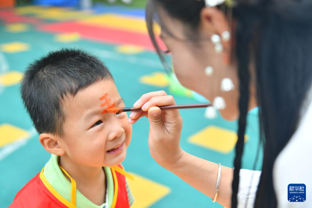 5月27日,在江西省吉安市吉州区馨悦幼儿园,老师蘸取雄黄为孩子额头点上“王”字。新华社发(张建明摄)